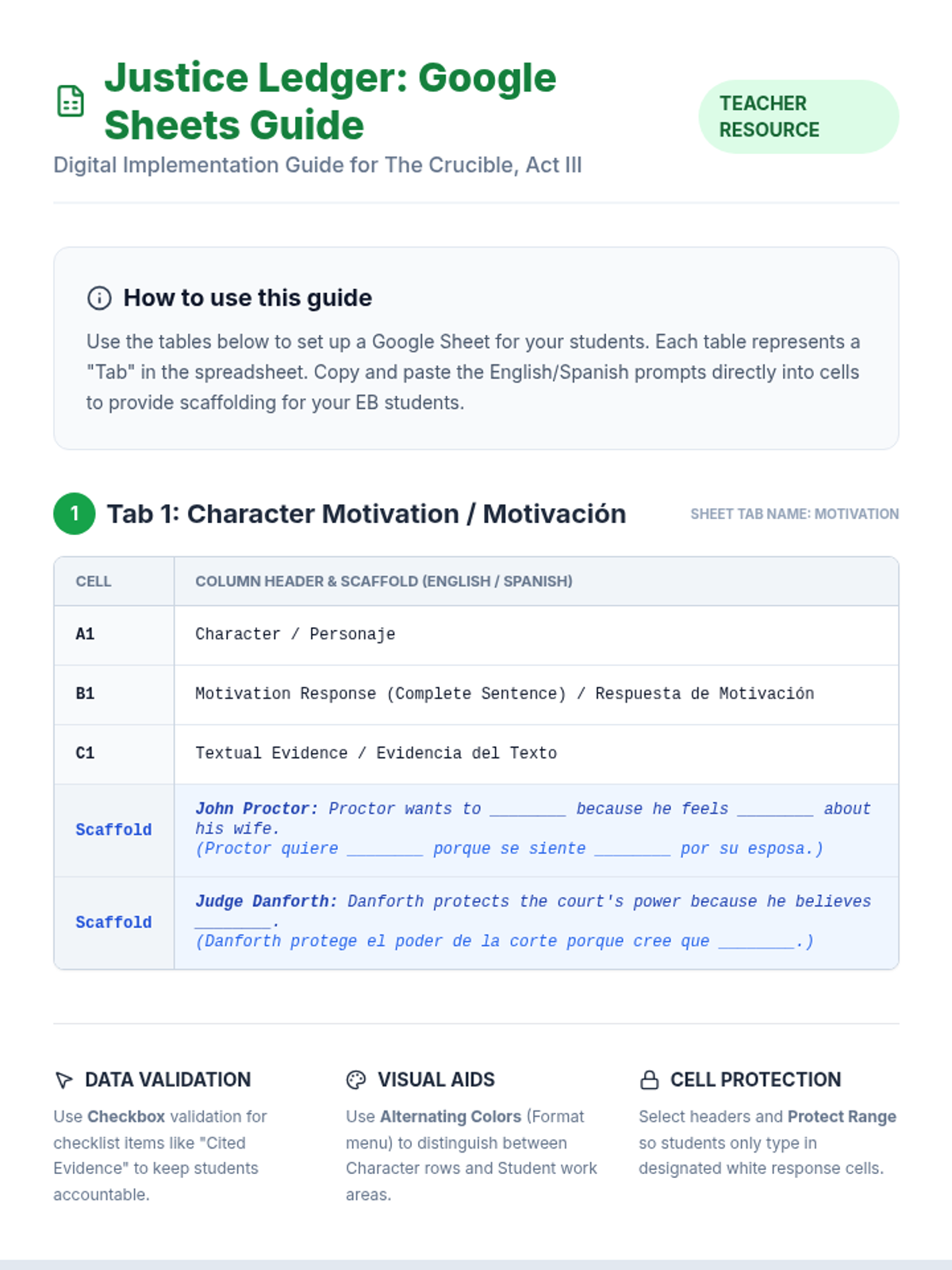A teacher resource that provides a step-by-step layout for setting up a Google Sheet for student responses, including copy-pasteable bilingual prompts and frames.