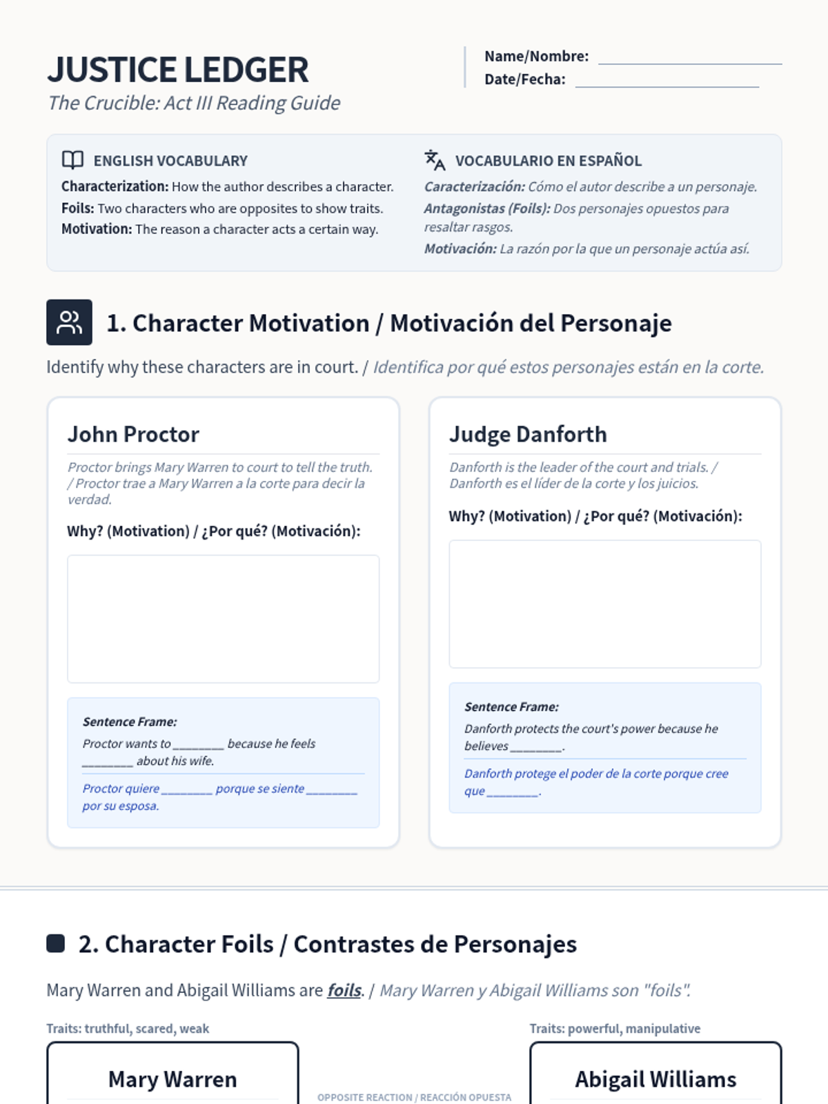 A bilingual English/Spanish reading guide for Act III of The Crucible, featuring graphic organizers, sentence frames, and visual support for characterization and tone analysis. Includes specific requirements for complete sentences and textual evidence.