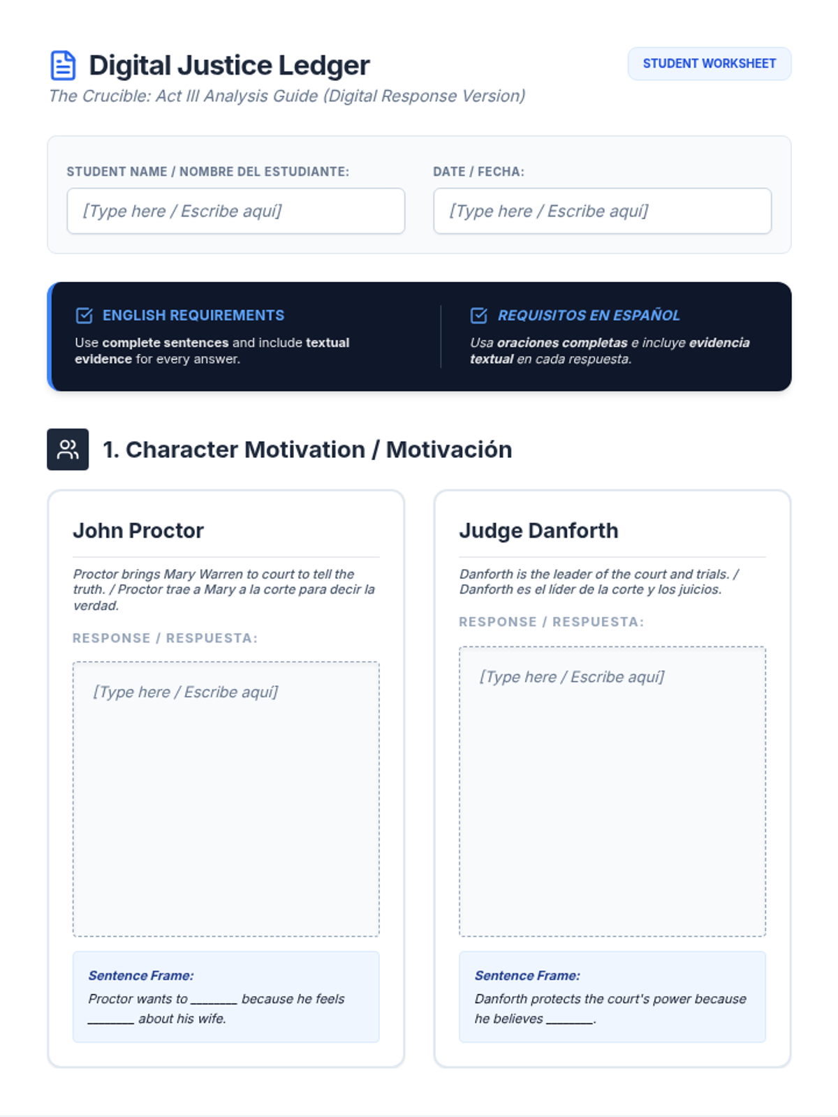 A digital version of the Justice Ledger worksheet designed for students to type their responses directly into clear work areas. Features bilingual support, sentence frames, and prominent instructions for evidence-based writing.