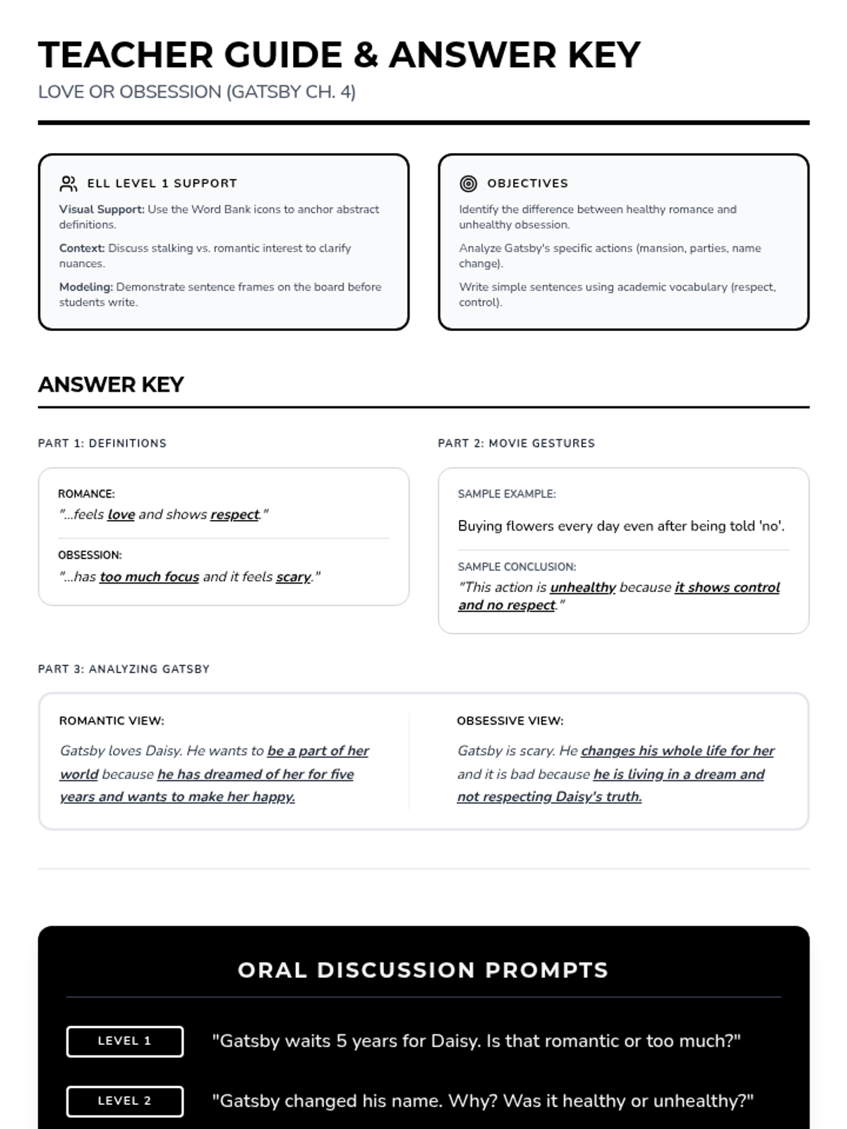 A teacher's guide and answer key for the Gatsby Romance vs. Obsession lesson. Includes instructional strategies for ELL Level 1, sample answers for sentence frames, and oral discussion prompts categorized by proficiency level. Revised for print efficiency and high contrast.