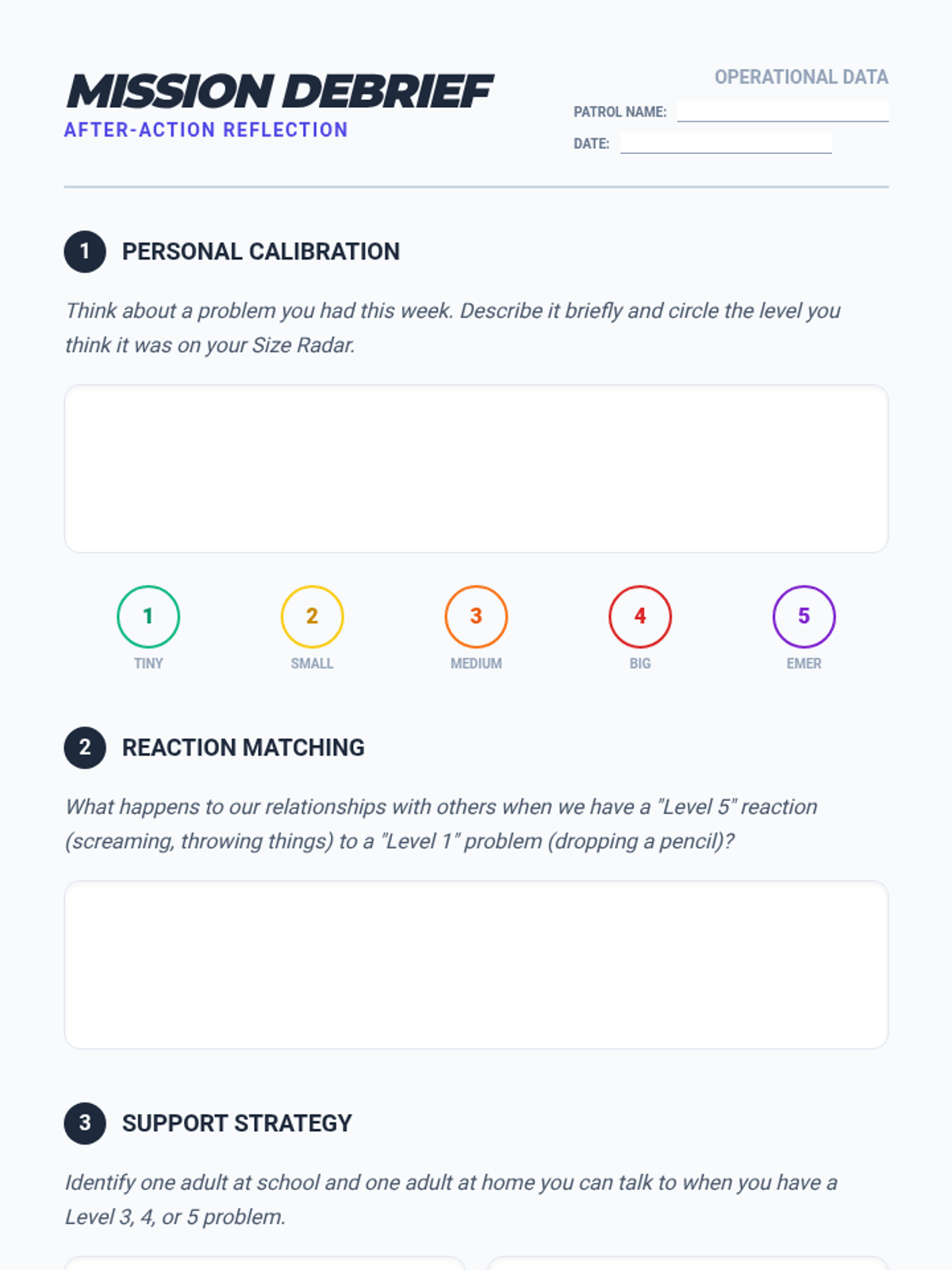 A reflection worksheet for students to complete after playing the Problem Patrol game, helping them apply the 5-point scale to their own lives and understand the importance of matching their reactions.