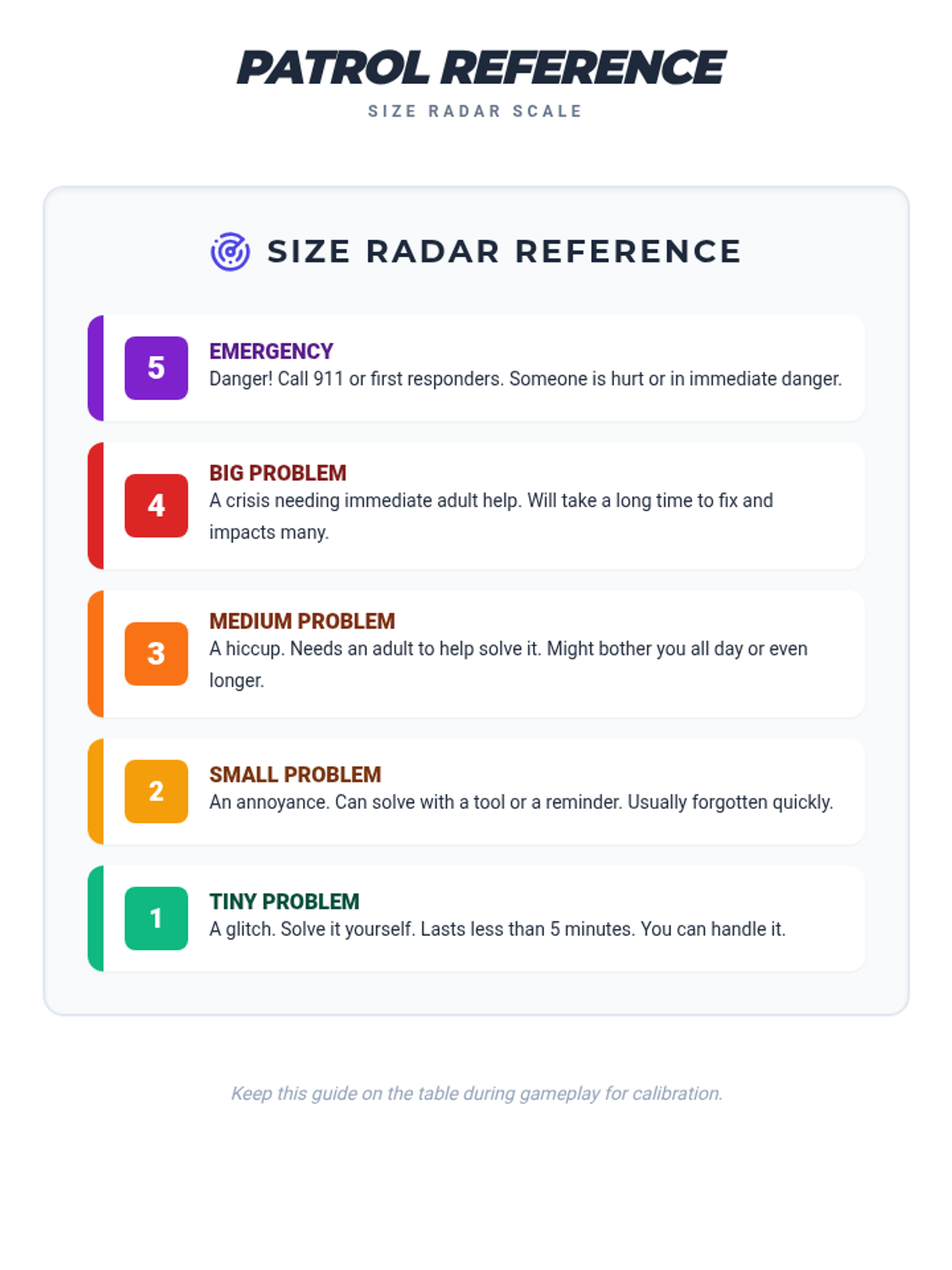 A compact 5-point 'Size Radar Reference' guide for players to use during the Problem Patrol game, providing descriptions and examples for each problem level.