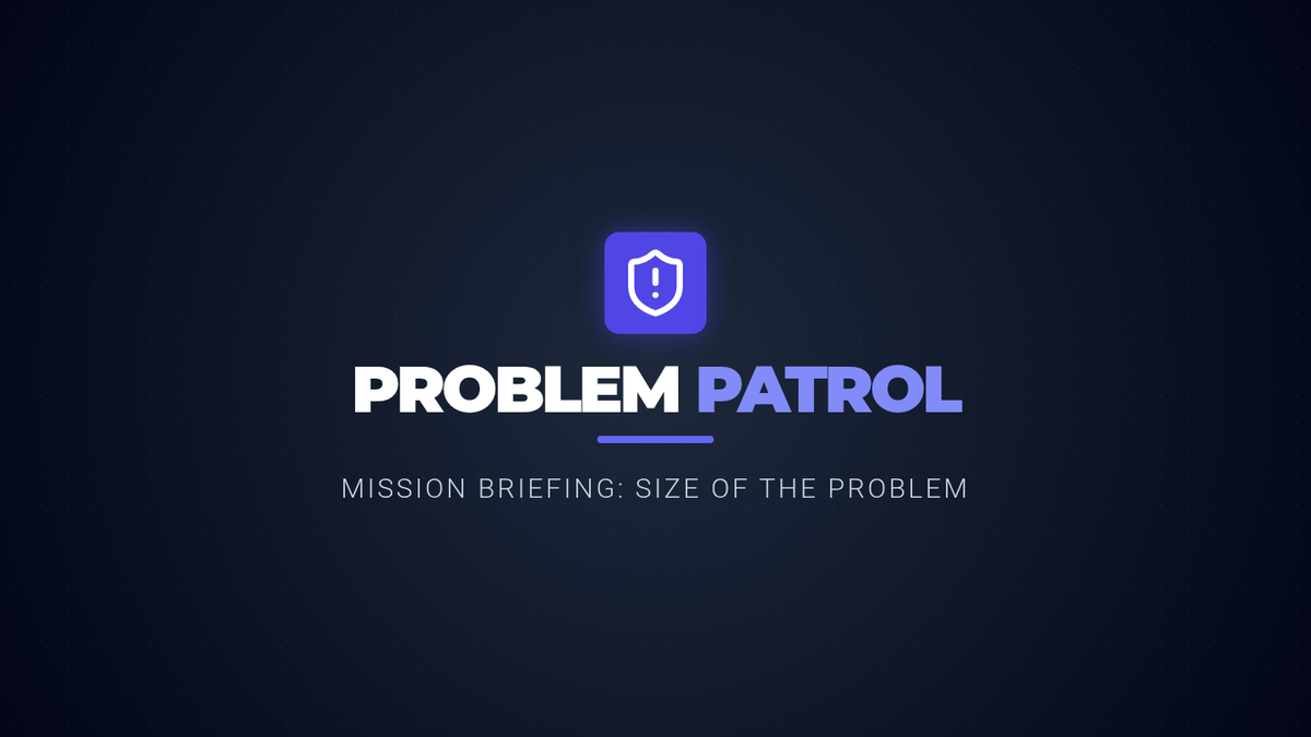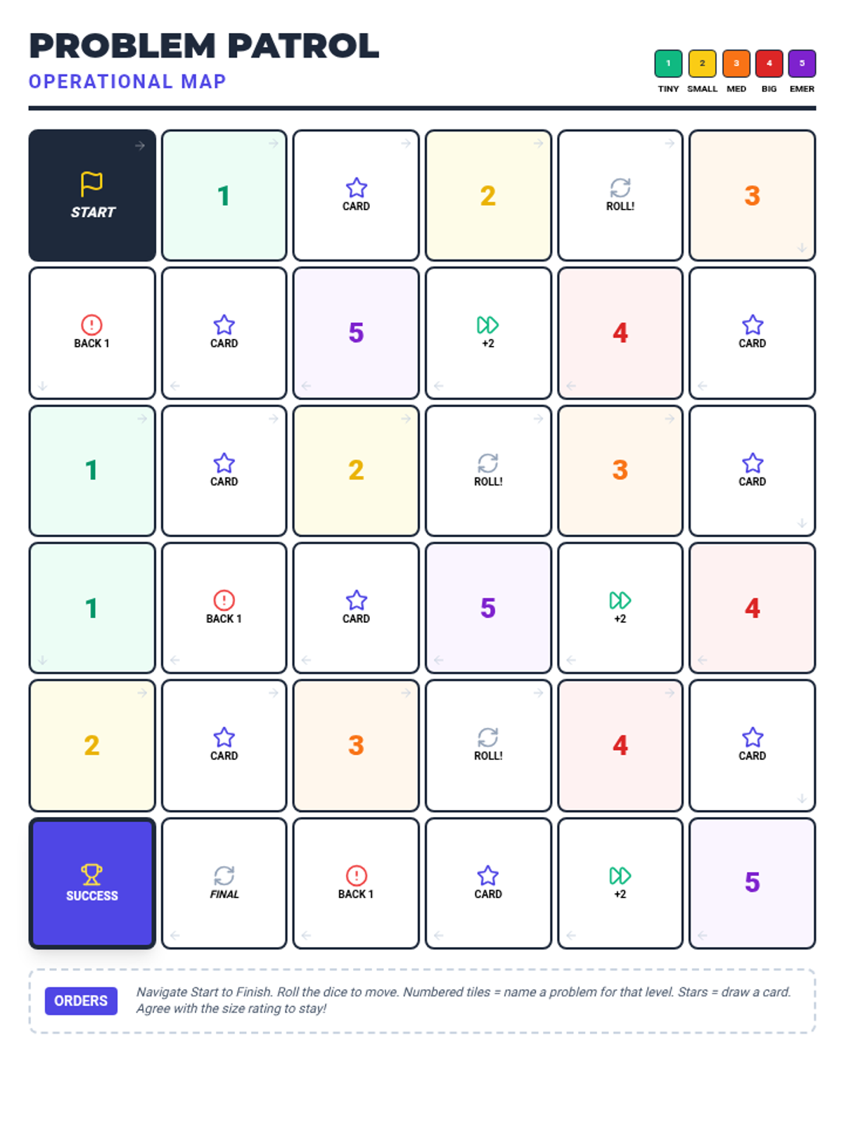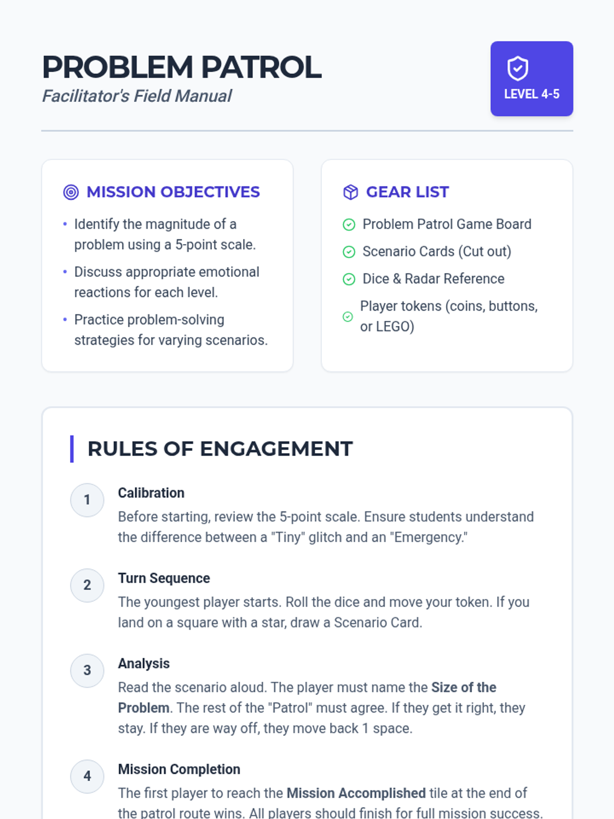 A facilitator guide for the Problem Patrol game, outlining learning objectives, setup instructions, rules of engagement, and discussion prompts for teaching the 5-point Size of the Problem scale.