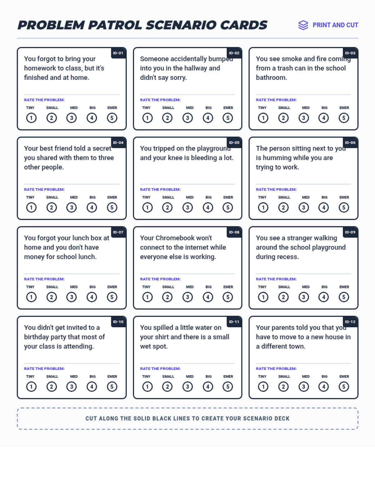 A set of 12 scenario cards tailored for 4th and 5th graders, featuring common school and social challenges ranging from 'dropping a pencil' to 'emergency' situations, designed to be cut out for use with the Problem Patrol board game.