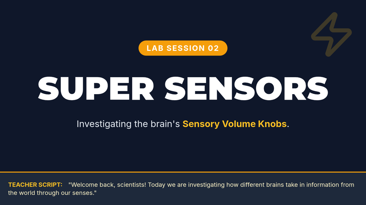 Day 2 slides exploring sensory processing differences and the 'volume knob' analogy for hyper- and hypo-sensitivity. Expanded for a full 15-minute lesson with teacher notes. Revised layout for better PDF rendering of teacher notes.