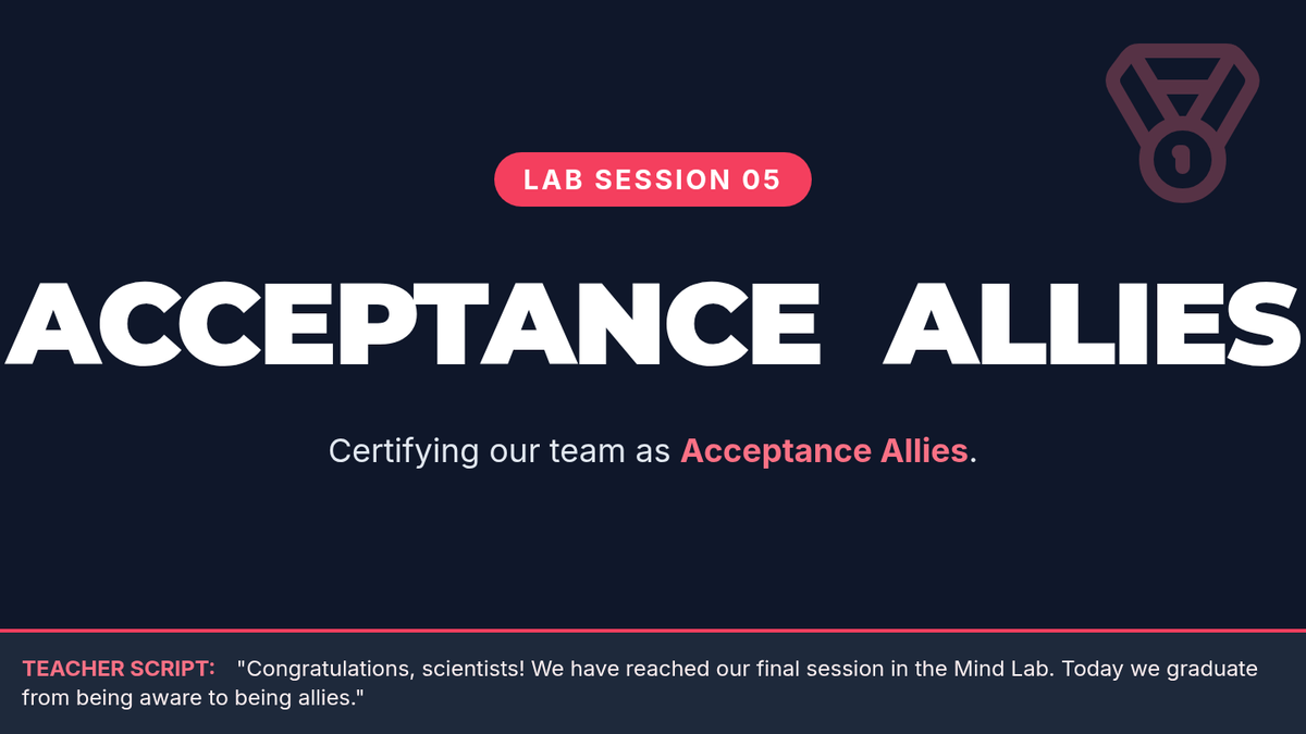 Day 5 slides focusing on the transition from awareness to acceptance and the Acceptance Ally pledge. Expanded for a full 15-minute lesson with teacher notes. Revised layout for better PDF rendering of teacher notes. Now with improved spacing and contrast. Now with improved spacing and contrast.