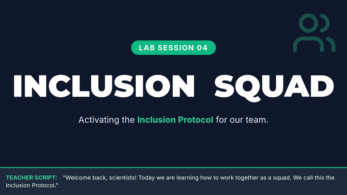 Day 4 slides introducing the 'Inclusion Protocol': Wait, Invite, and Adjust. Now expanded for a full 15-minute lesson with teacher notes. Revised layout for better PDF rendering of teacher notes. Now with improved spacing and contrast.