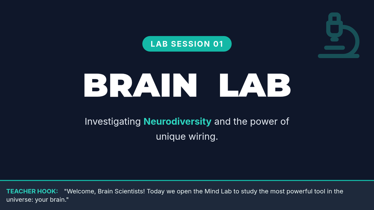 Day 1 slides focused on introducing the 'Mind Lab' and the concept of Neurodiversity using the fingerprint analogy. Now expanded with teacher notes and more slides for a full 15-minute lesson. Revised layout for better PDF rendering of teacher notes. Now with improved spacing and contrast.