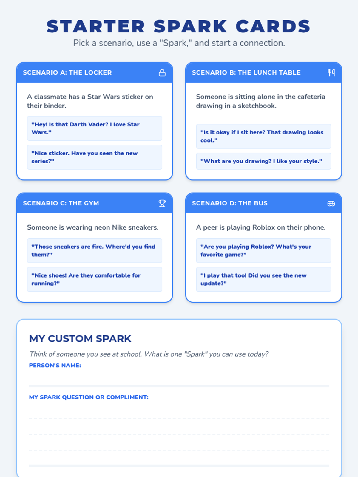 Interactive task cards presenting common middle school scenarios and suggested "spark" questions to help students initiate conversations.