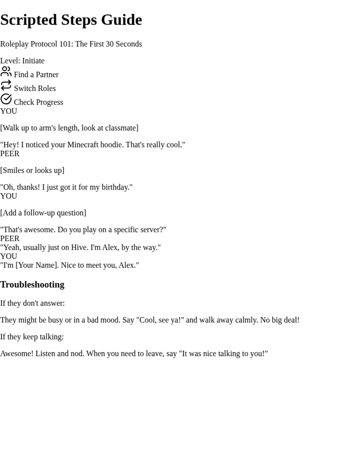 A structured roleplay script for 7th graders to practice the first 30 seconds of an interaction, including greetings, compliments, and self-introductions.