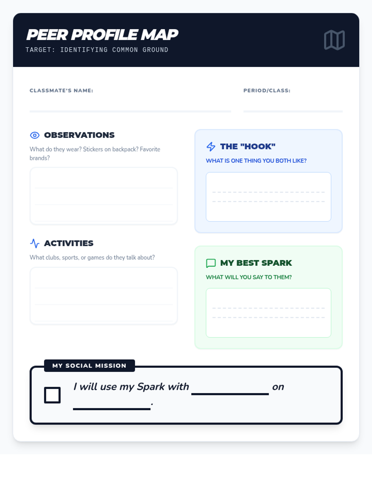 A graphic organizer designed to help students with autism observe peers and identify shared interests ("hooks") to use as conversation starters.
