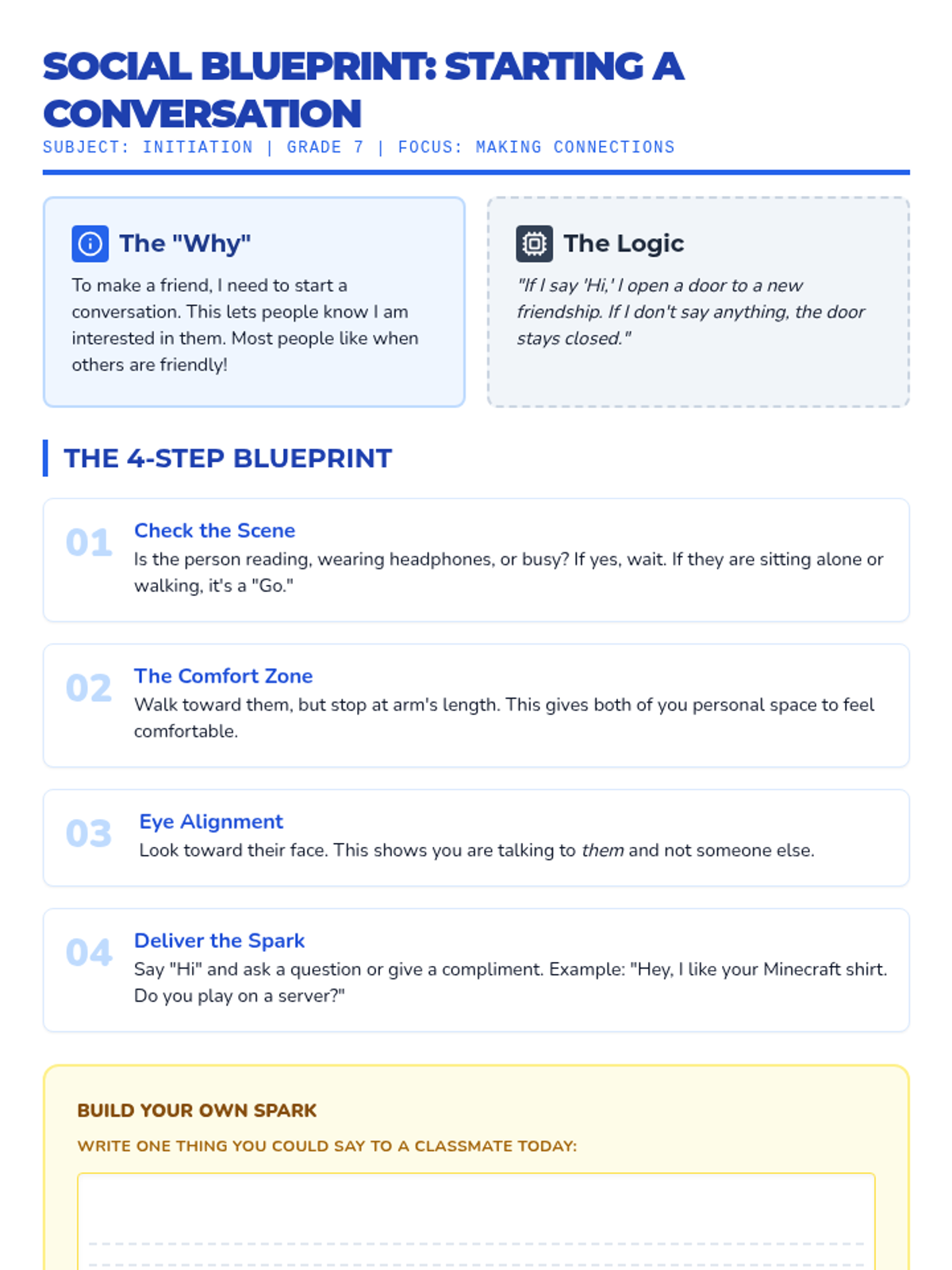 A visual social story for 7th-grade students using a "Blueprint" theme to explain the social logic and concrete steps of starting a conversation.
