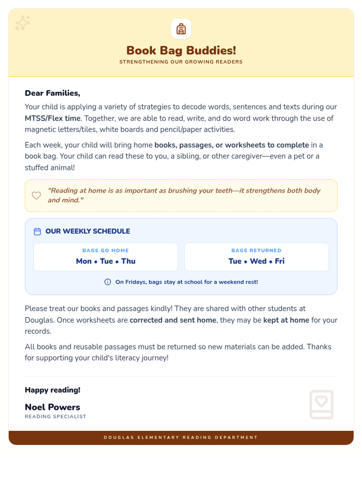 An updated introductory letter for parents from Reading Specialist Noel Powers, detailing MTSS/Flex time activities and home reading tips. It explicitly mentions that books, passages, and worksheets will be sent home for practice, and clarifies that corrected worksheets can be kept at home. Enlarged text and friendly fonts for better legibility.