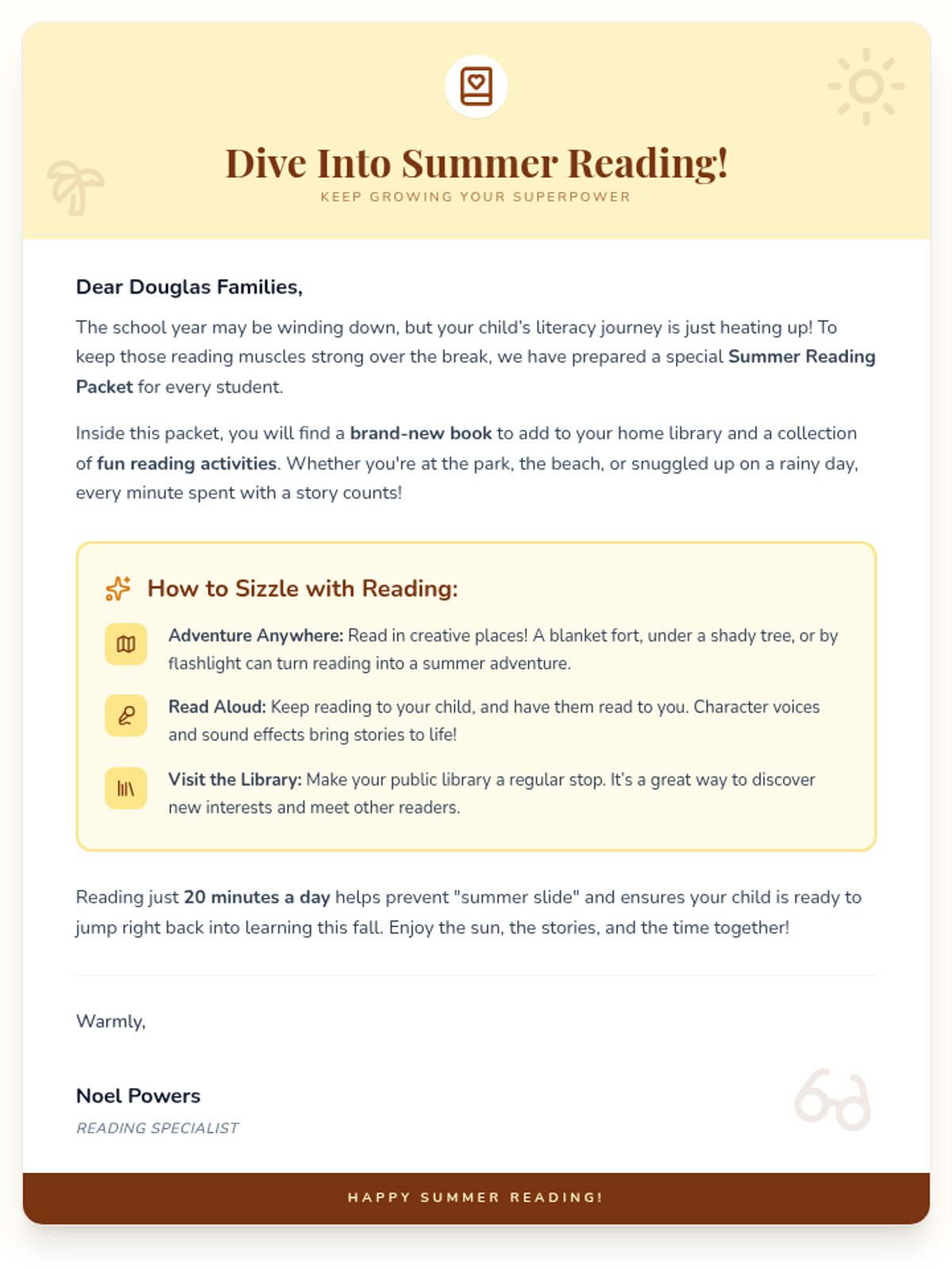 A warm, sun-themed introductory letter for summer reading packets. It encourages K-3 students to read over the break, mentions the included book and a few reading games, and provides tips for parents. Optimized for single-page printing.