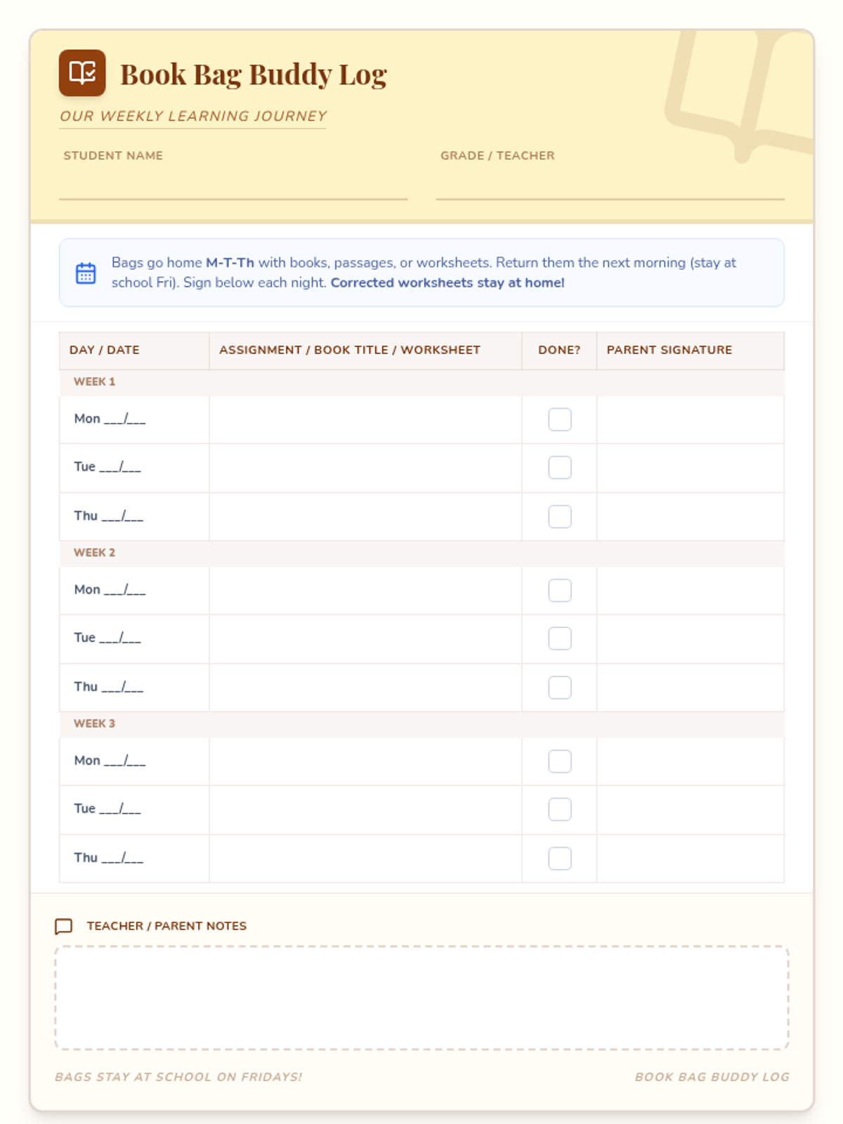 A charming, book-themed homework bag log for K-3 students and parents, updated with a Monday-Tuesday-Thursday schedule. Explicitly mentions books, passages, and worksheets in the instructions and table headers, and clarifies that corrected worksheets stay at home. Features extra-large writing spaces and an expanded communication box, fully optimized for single-page printing.