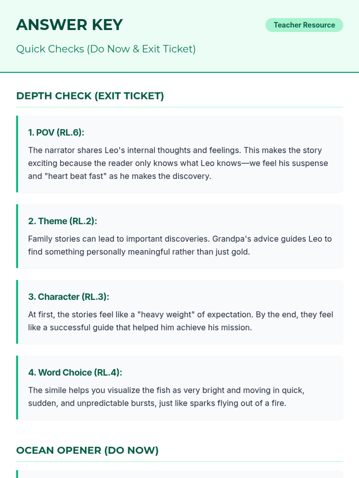 Comprehensive answer key for the Depth Check Exit Ticket and Ocean Opener Do Now activities. Provides expected responses and rationales for teacher reference. Optimized layout for printing.