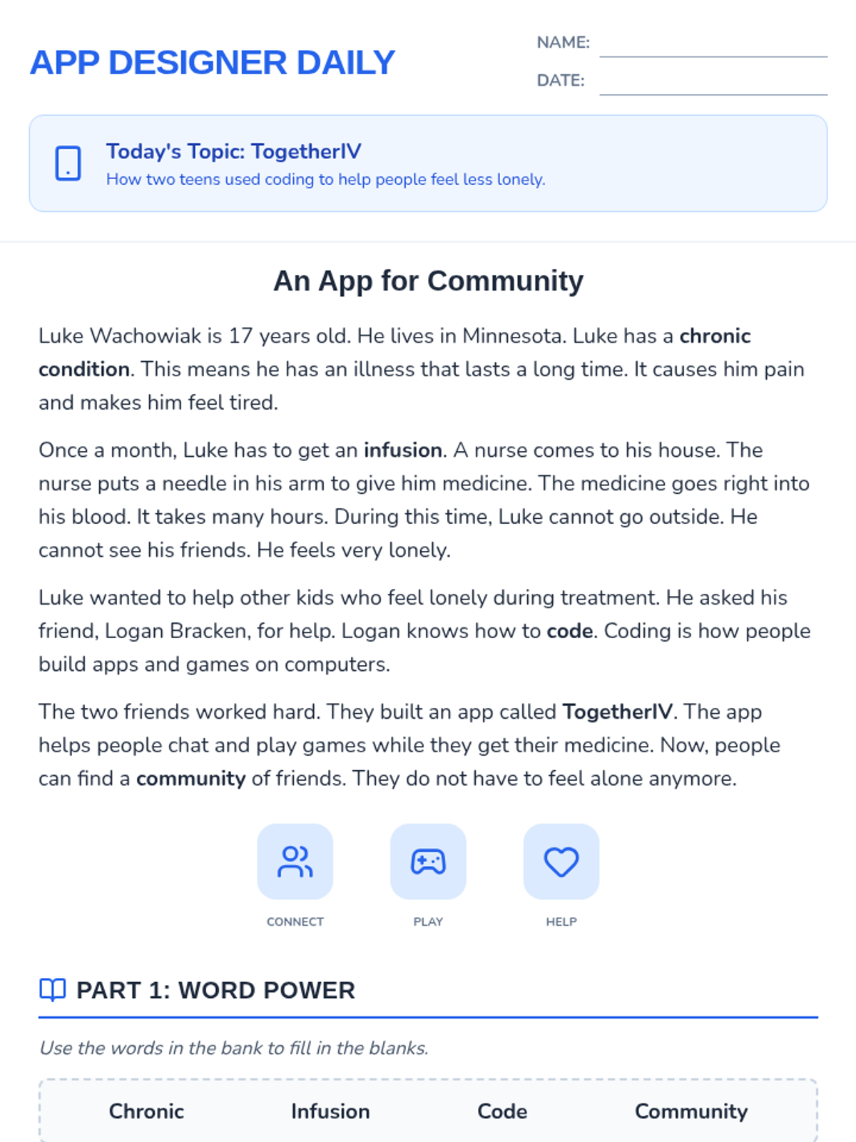 A 3-page comprehensive reading packet for 8th-grade students working at a 3rd-grade reading level. Includes a simplified article about the TogetherIV app, vocabulary exercises, comprehension questions, a sequencing activity, and a scaffolded writing response section.