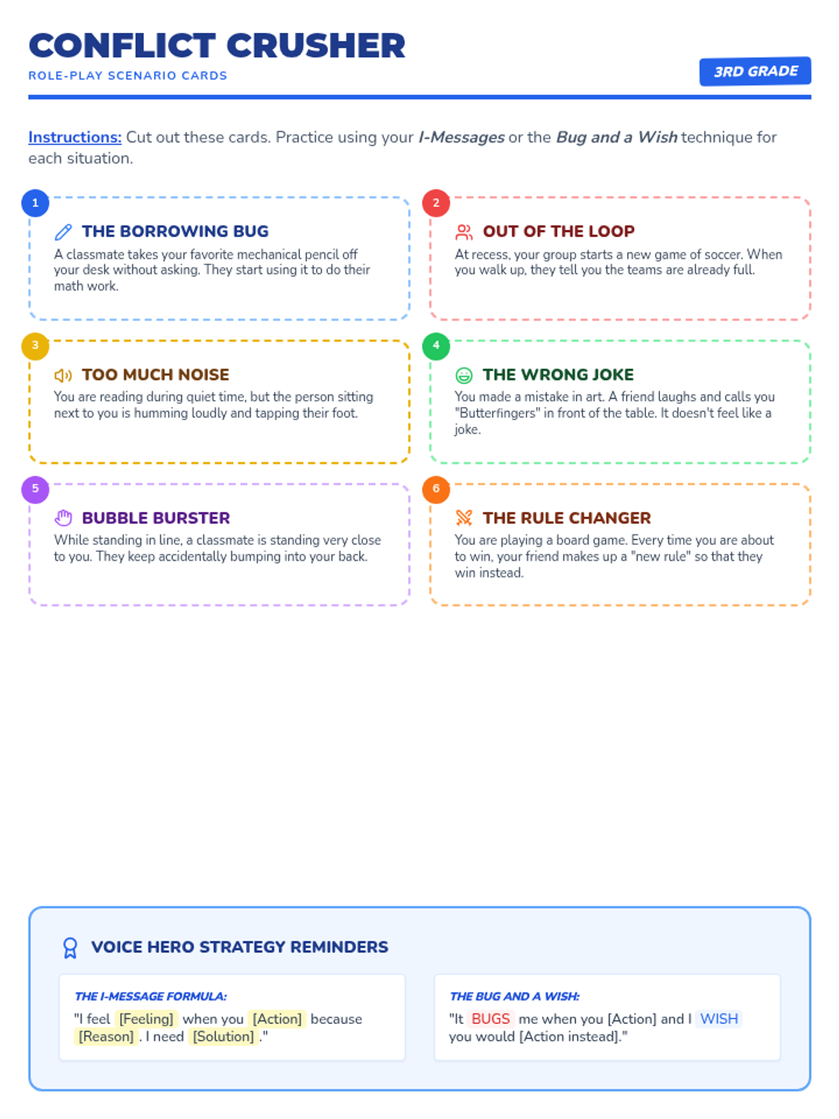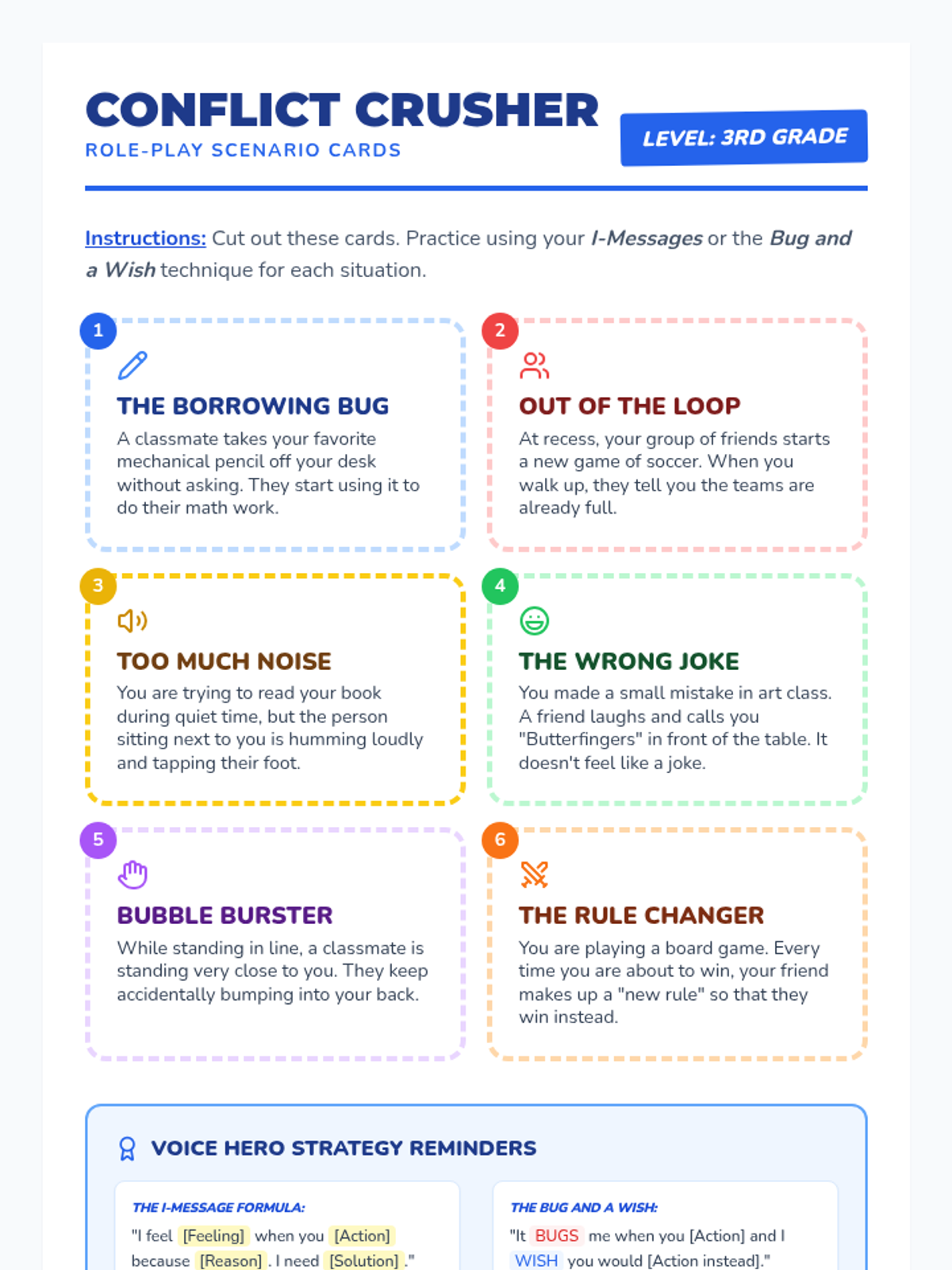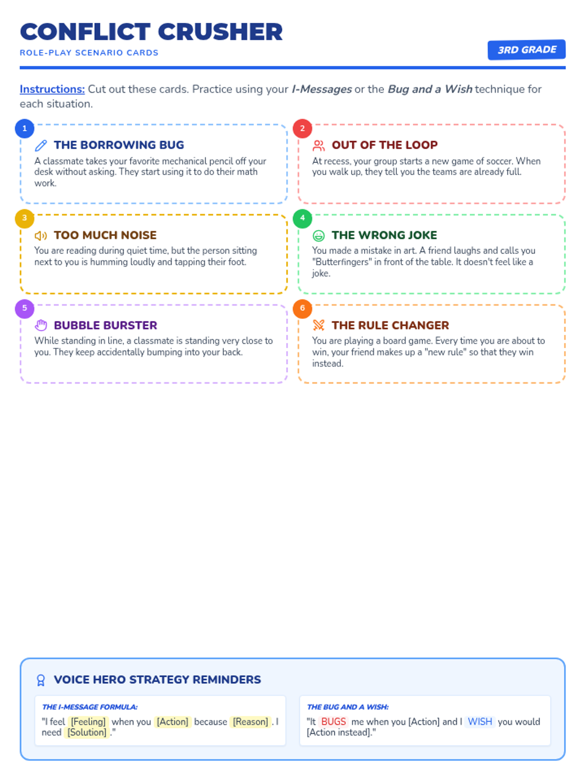 A set of 6 printable role-play cards featuring common third-grade peer conflict scenarios. Updated layout to ensure all cards fit on a single page for printing. Revised I-Message formula punctuation.