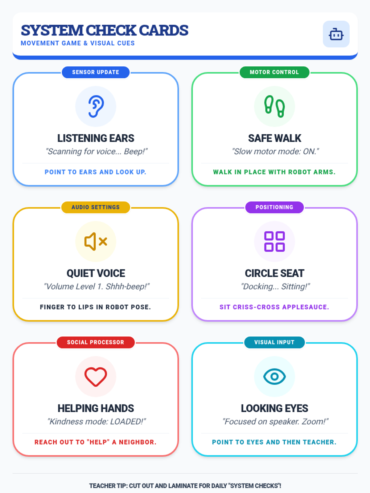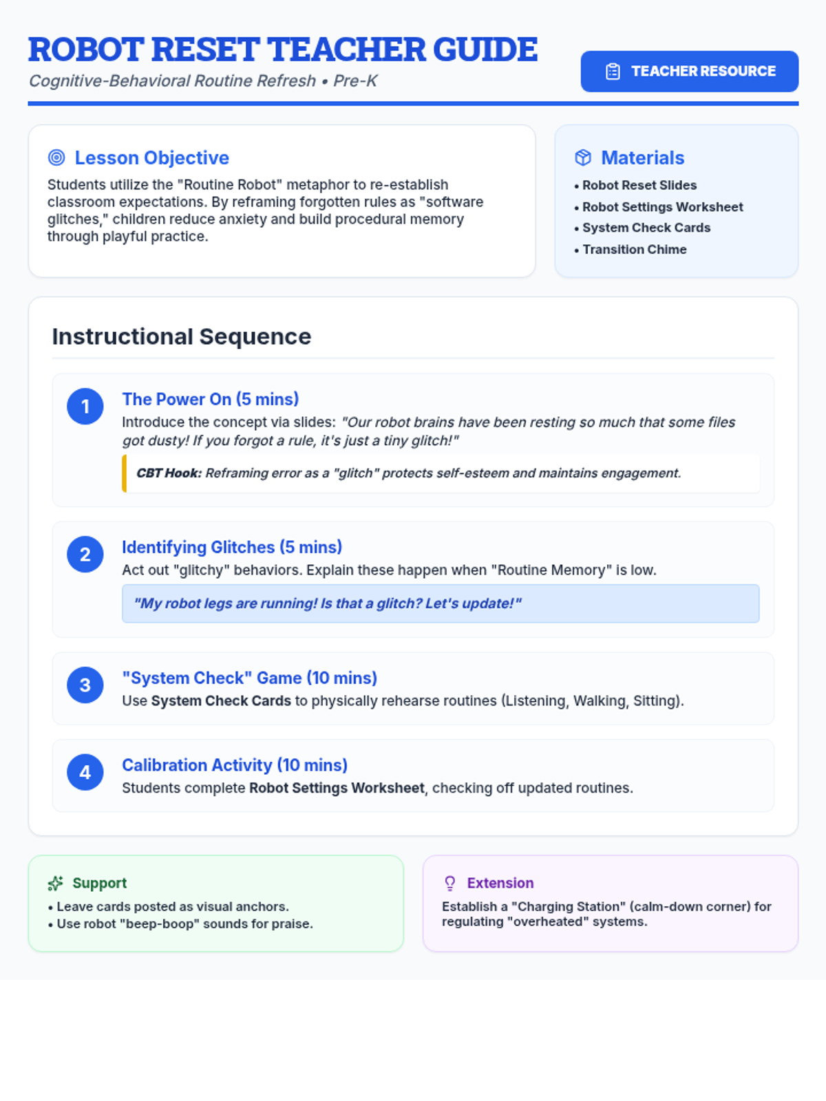 A detailed instructional guide for teachers to deliver the Routine Robot Reset lesson. Includes learning objectives, step-by-step procedures, movement game instructions, and cognitive-behavioral strategies for managing transitions and routines.