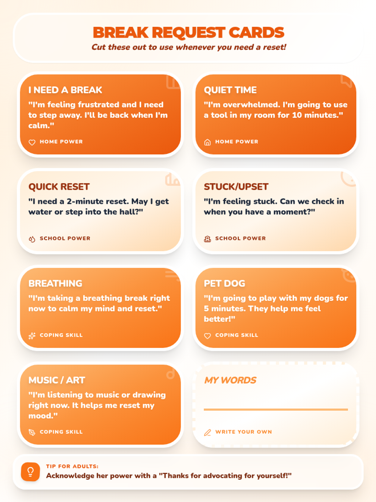A printable set of 8 self-advocacy and coping cards for a 6th-grade girl to use at home and school. It features a lush, swirly creamsicle aesthetic with vibrant gradients and bold, rounded typography. Designed to fit on a single page.