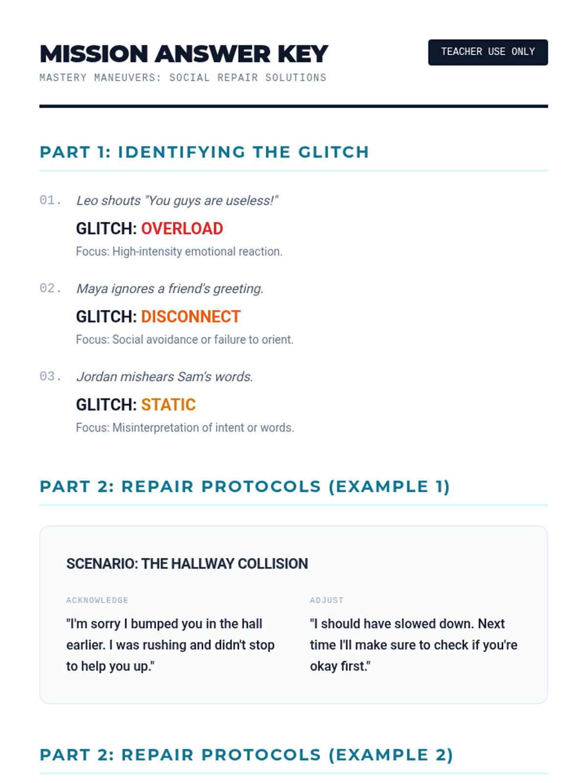 A revised Mastery Maneuvers answer key for the Commander Comms lesson, fixing page break issues in scenario blocks and resolving label overlap problems.