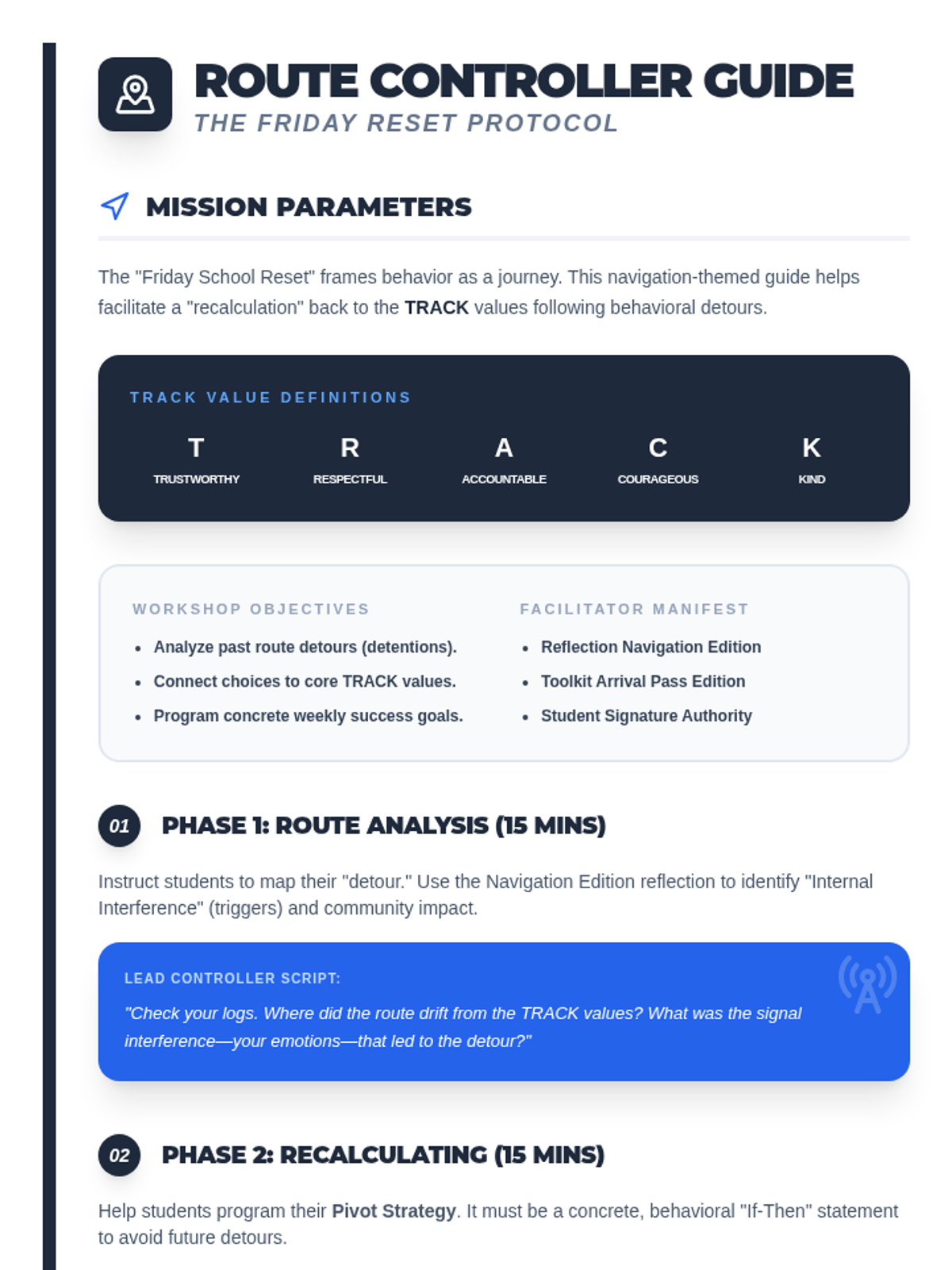 A professional facilitator's guide using a transit/navigation theme to provide instructional objectives and restorative script prompts for leading the Friday Reset workshop.