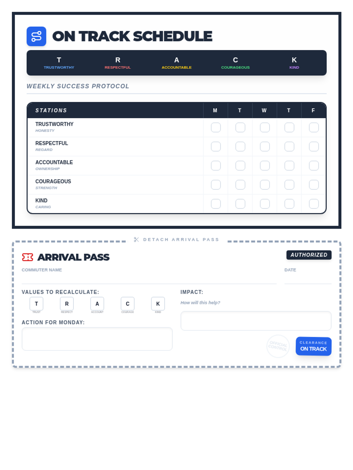 A student-facing toolkit using a transit/navigation theme, containing a weekly TRACK success checklist and a detachable arrival pass to formalize commitments before leaving detention.