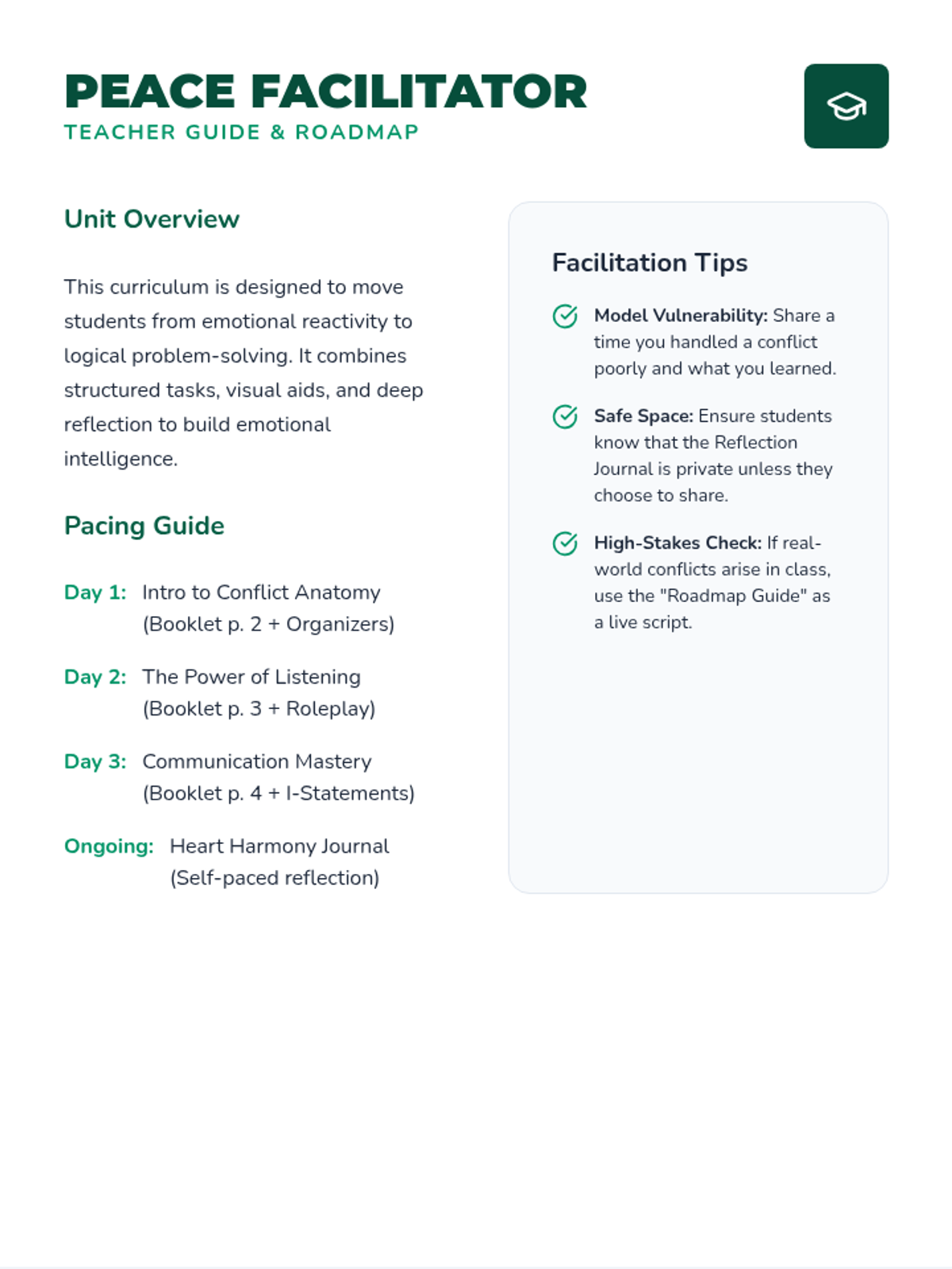 A comprehensive facilitator guide for teachers, including unit pacing, teaching tips, and answer keys for student materials.