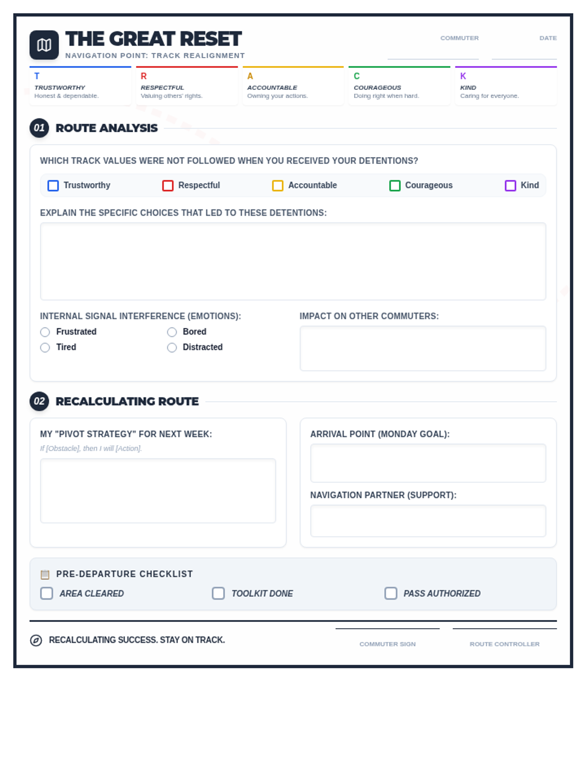 A one-page behavioral reflection sheet using a modern transit/navigation theme to help students analyze past detours, identify internal interference, and recalculate their route back to TRACK values.