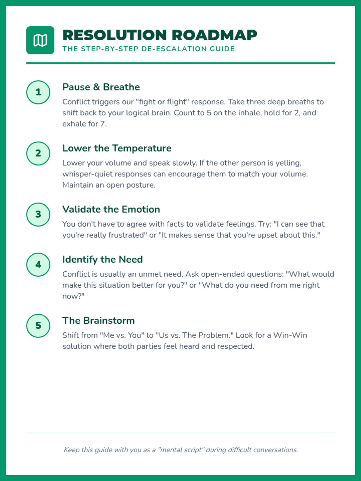 A step-by-step 'How-To' guide for de-escalating conflict, featuring five practical steps from breathing to brainstorming solutions.