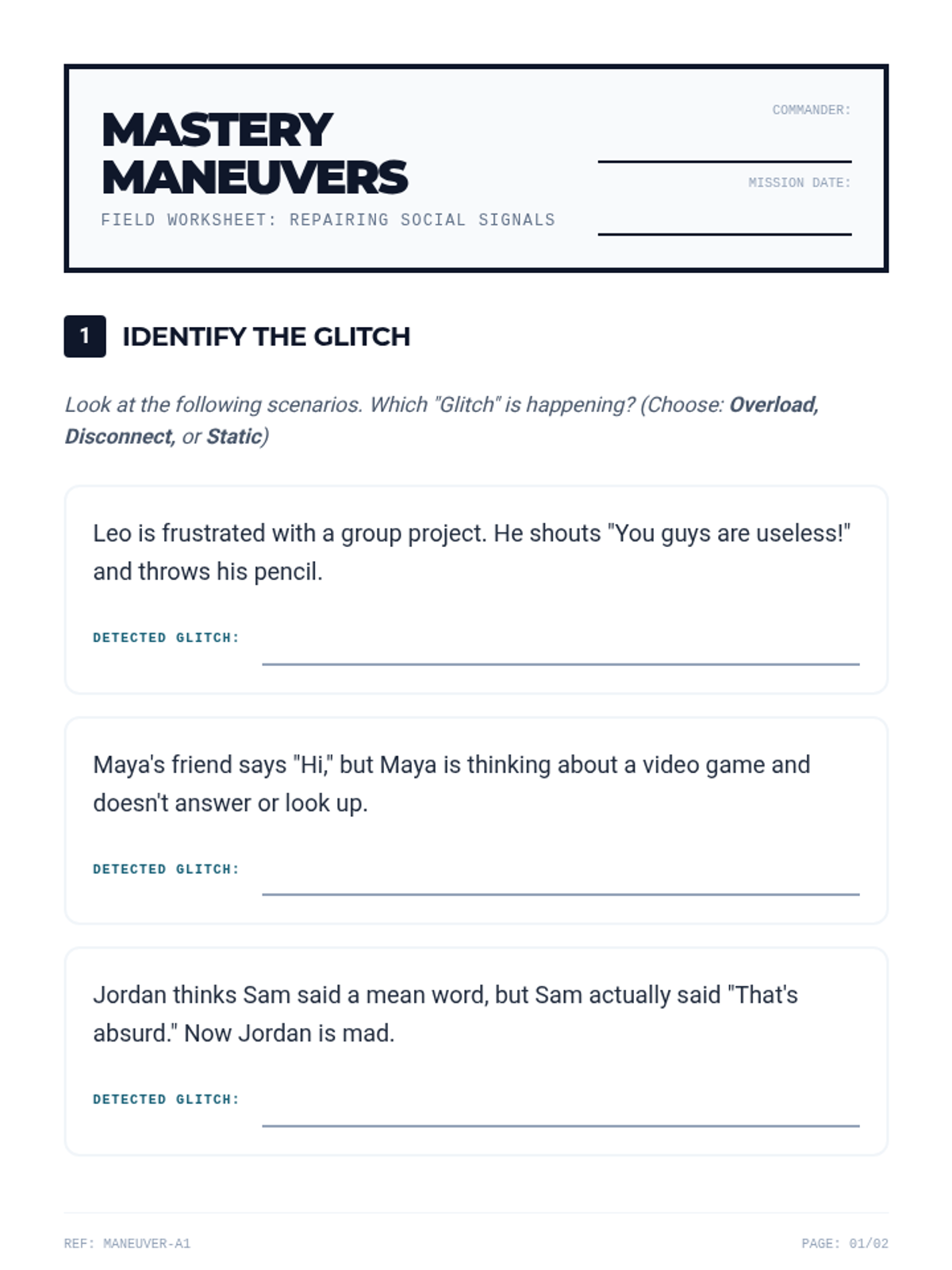 A revised Mastery Maneuvers worksheet for the Commander Comms lesson, fixing page break issues between sections, increasing answer box heights for handwriting, and adding vertical space for responses.
