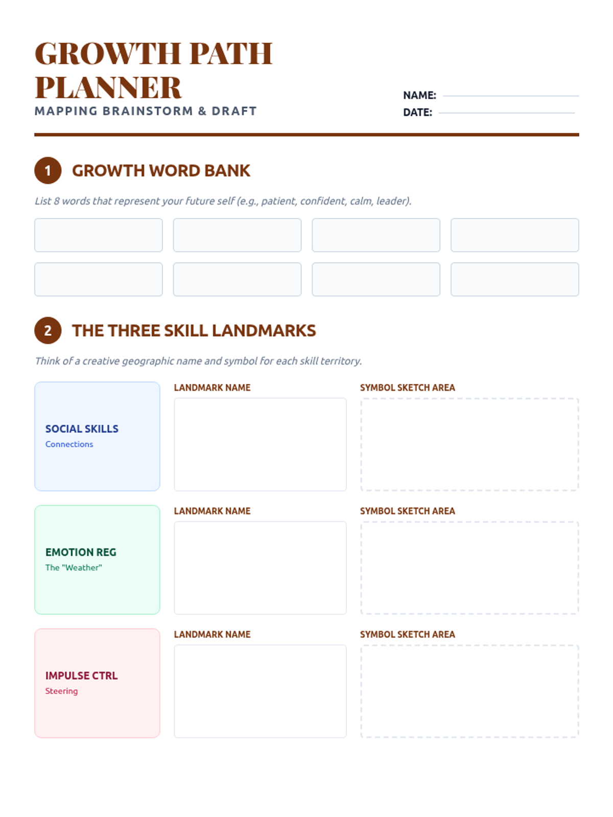 A brainstorming and sketching worksheet to help students plan their Future Map landmarks, word bank, and overall layout. Revised for better page flow and larger work areas.