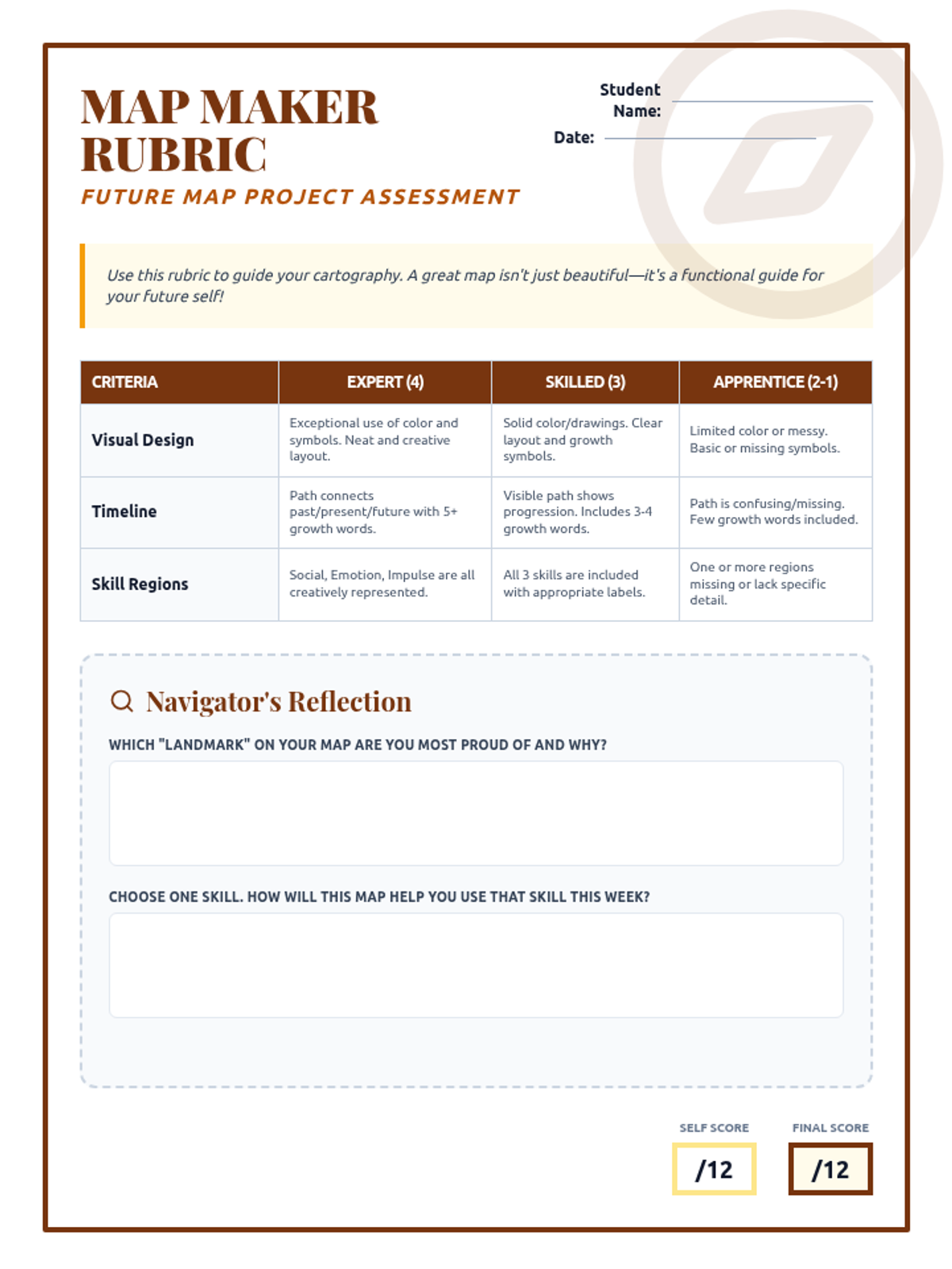 A detailed grading rubric for the Future Map project, featuring criteria for visual design, timeline development, and behavioral skill integration. Revised for single-page layout and larger work areas.
