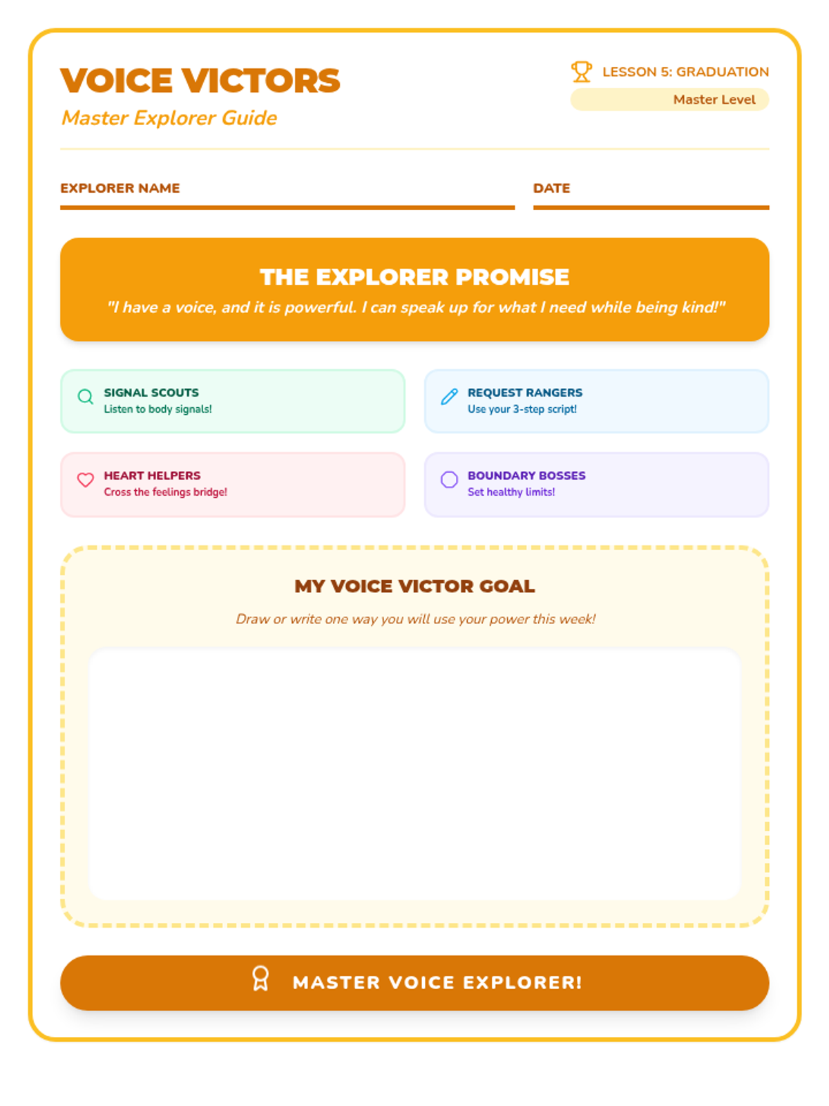 A master review sheet for the final 'Voice Victors' lesson, summarizing all four self-advocacy tools and providing a 'Voice Explorer Promise' for students to take home.