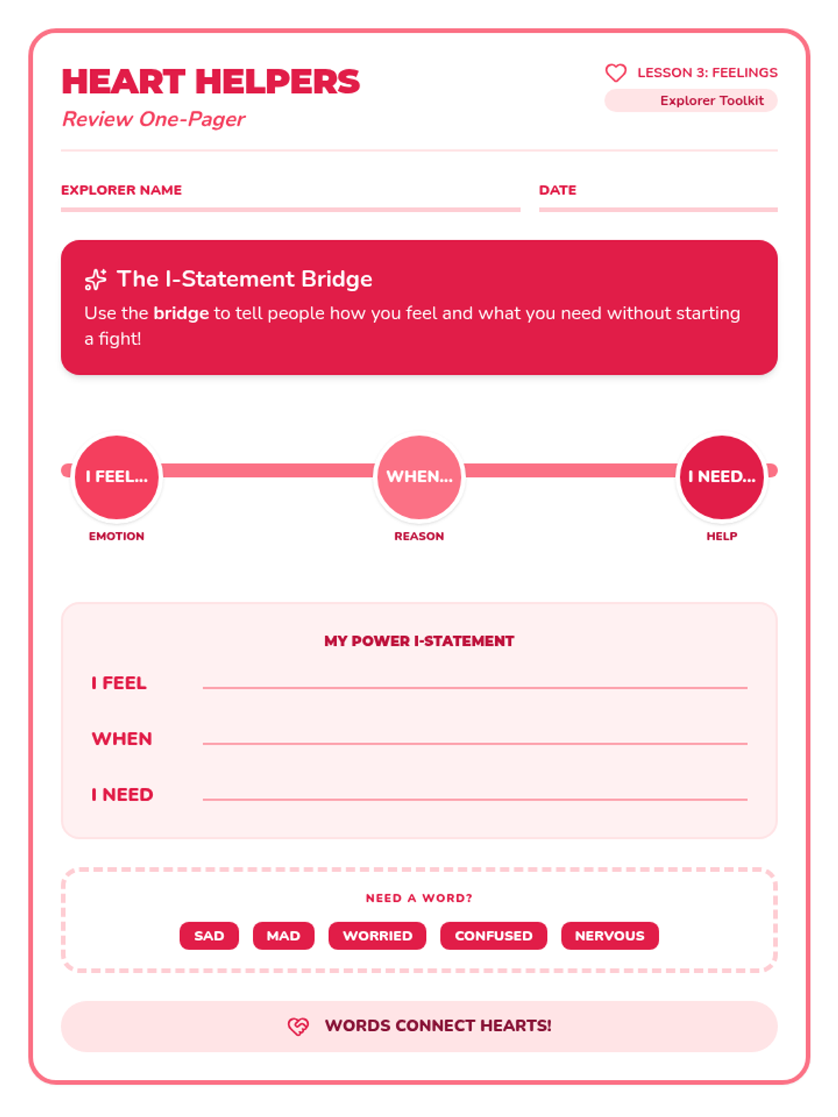 A single-page student review sheet for the 'Heart Helpers' lesson, featuring the I-Statement Bridge visual and an emotion word bank to help students express their feelings effectively.
