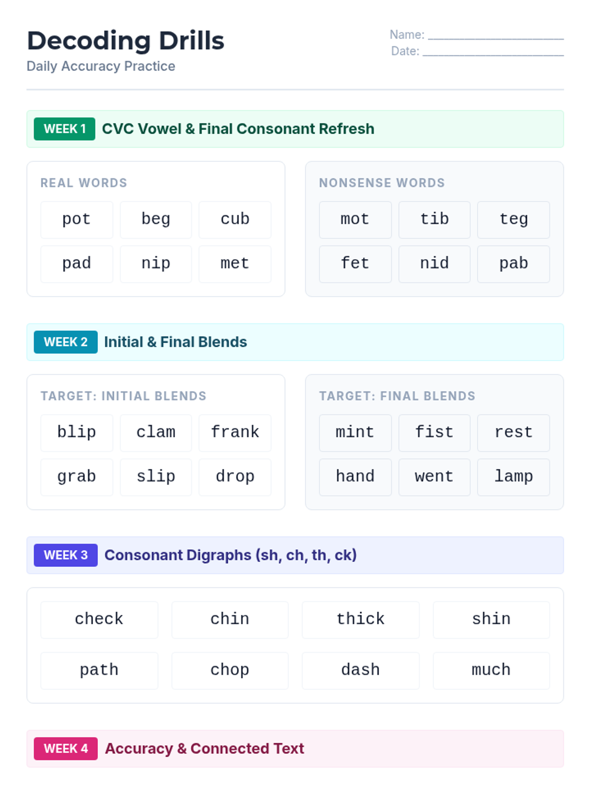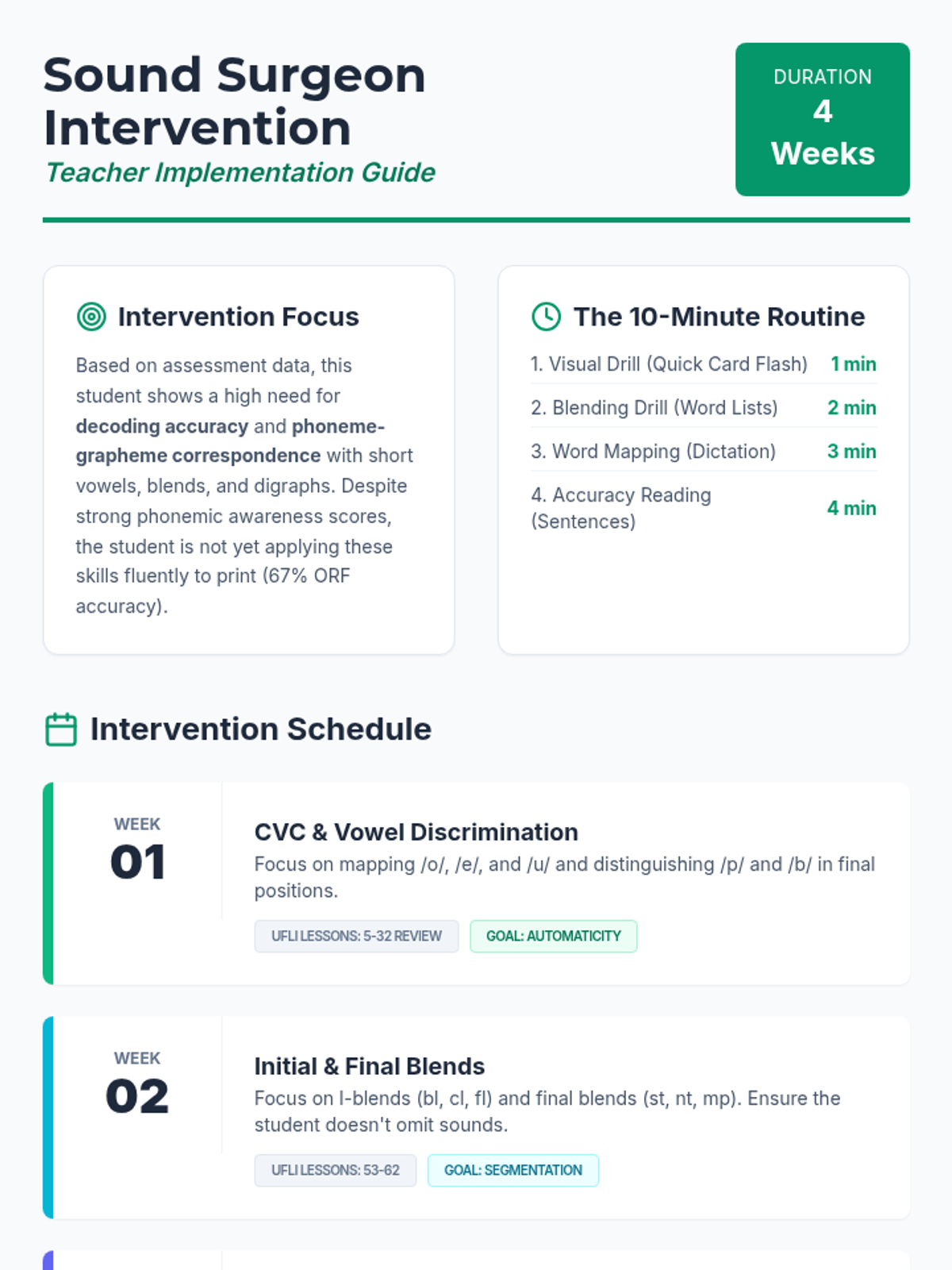 A comprehensive teacher implementation guide for a 4-week phonics intervention, detailing a 10-minute daily routine and weekly focus areas based on student data.