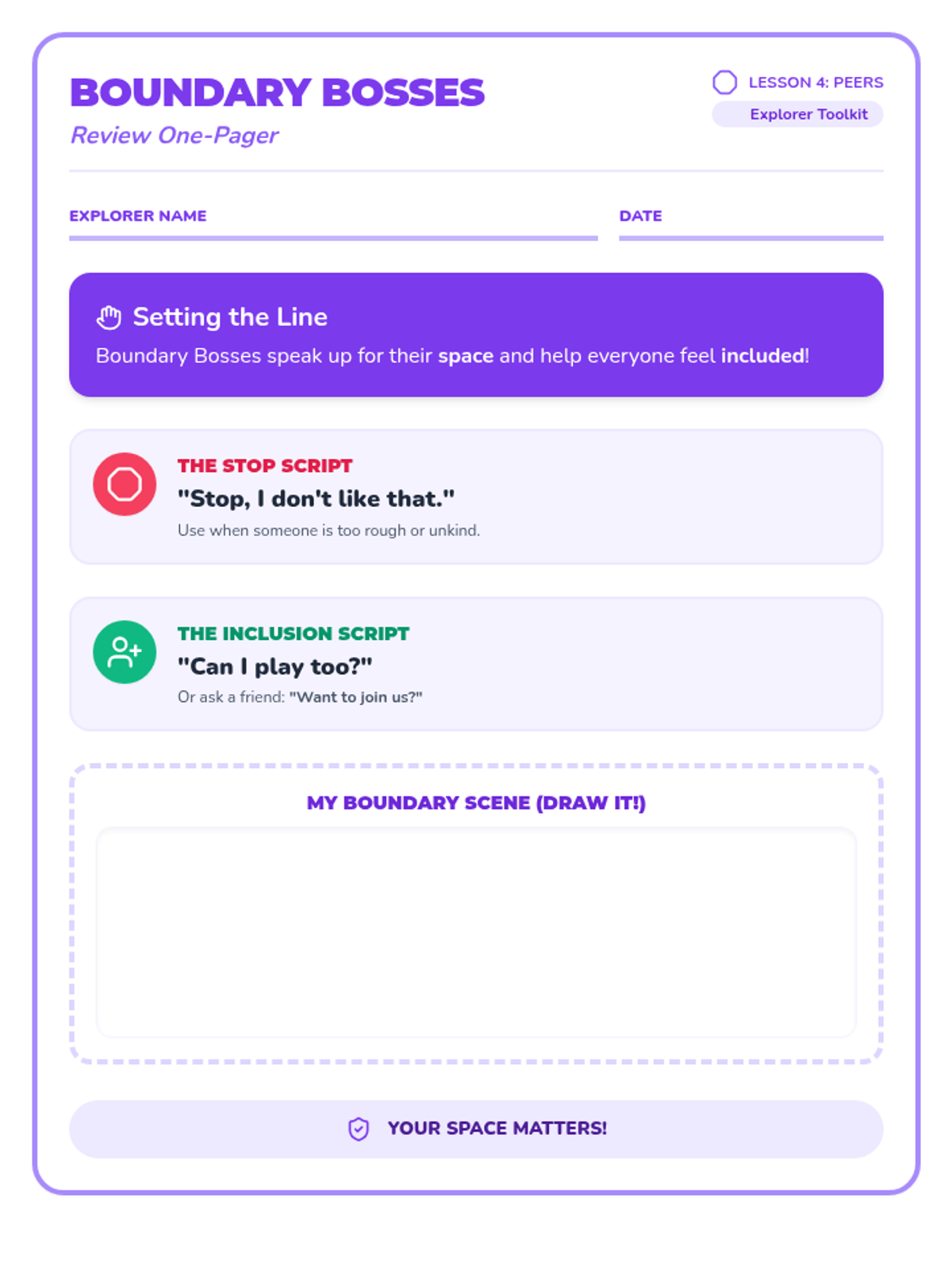 A single-page student review sheet for the 'Boundary Bosses' lesson, highlighting the 'Stop' and 'Inclusion' scripts with practical examples for peer interactions.