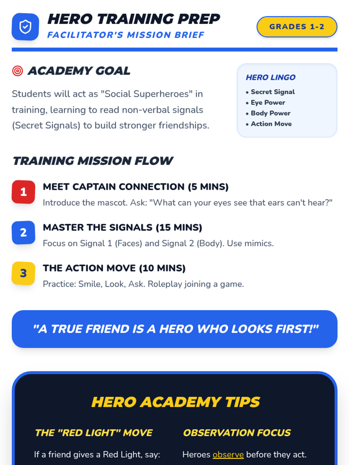 A comprehensive facilitator's guide for the Hero Academy lesson. Features "Captain Connection" themes, simplified lesson flow, and specific tips for managing student interactions in 1st-2nd grade. Updated layout to fix page breaks and content alignment. Condensed to 2 pages.