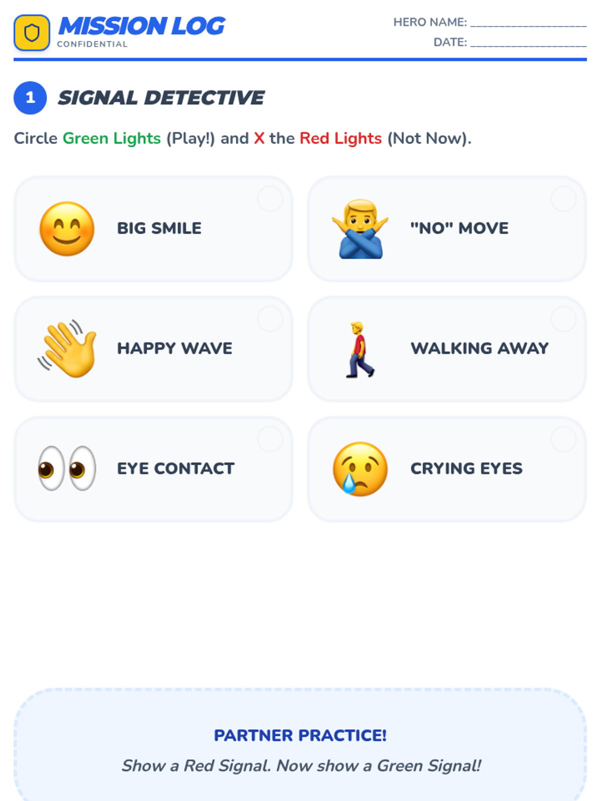 A kid-friendly "Hero Mission Log" for students to practice identifying social cues and planning friendship-building steps. Features simplified instructions, character badges, and expanded primary handwriting lines. Fixed page breaks and height issues. Optimized for 2-page print.