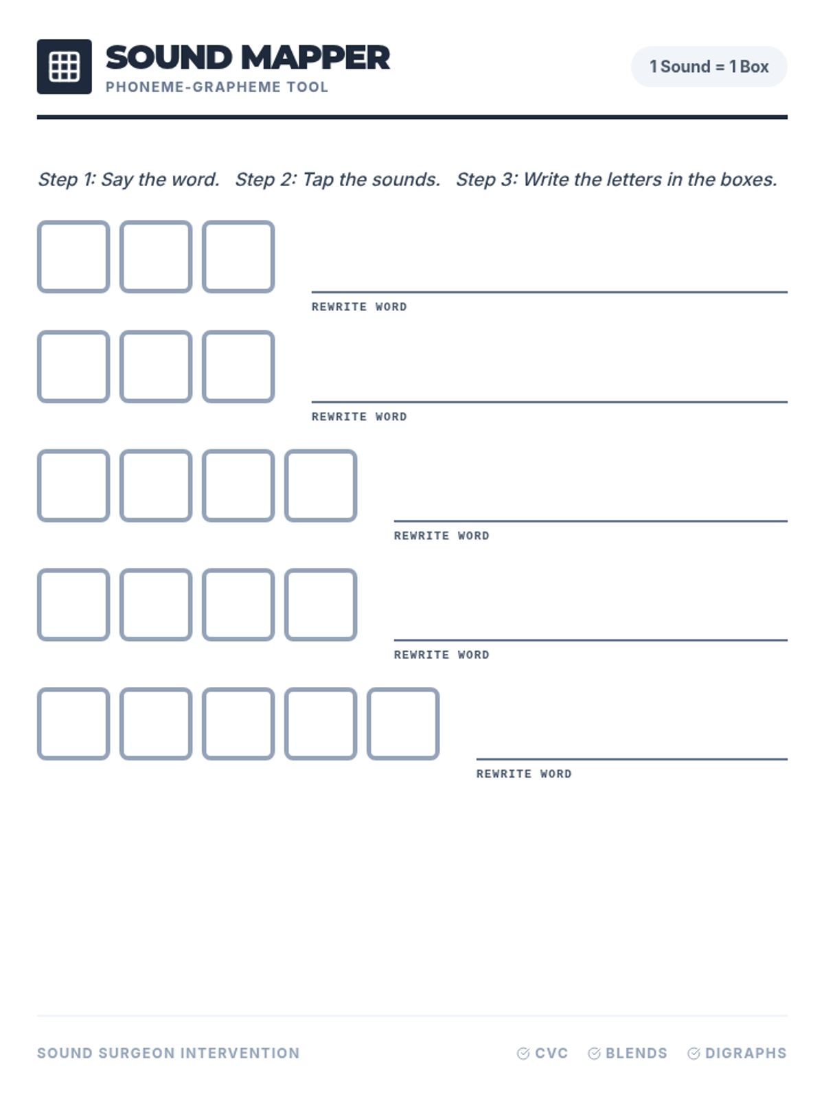 A reusable phoneme-grapheme mapping sheet designed for student dictation activities, allowing students to map sounds to boxes and then write the complete word.
