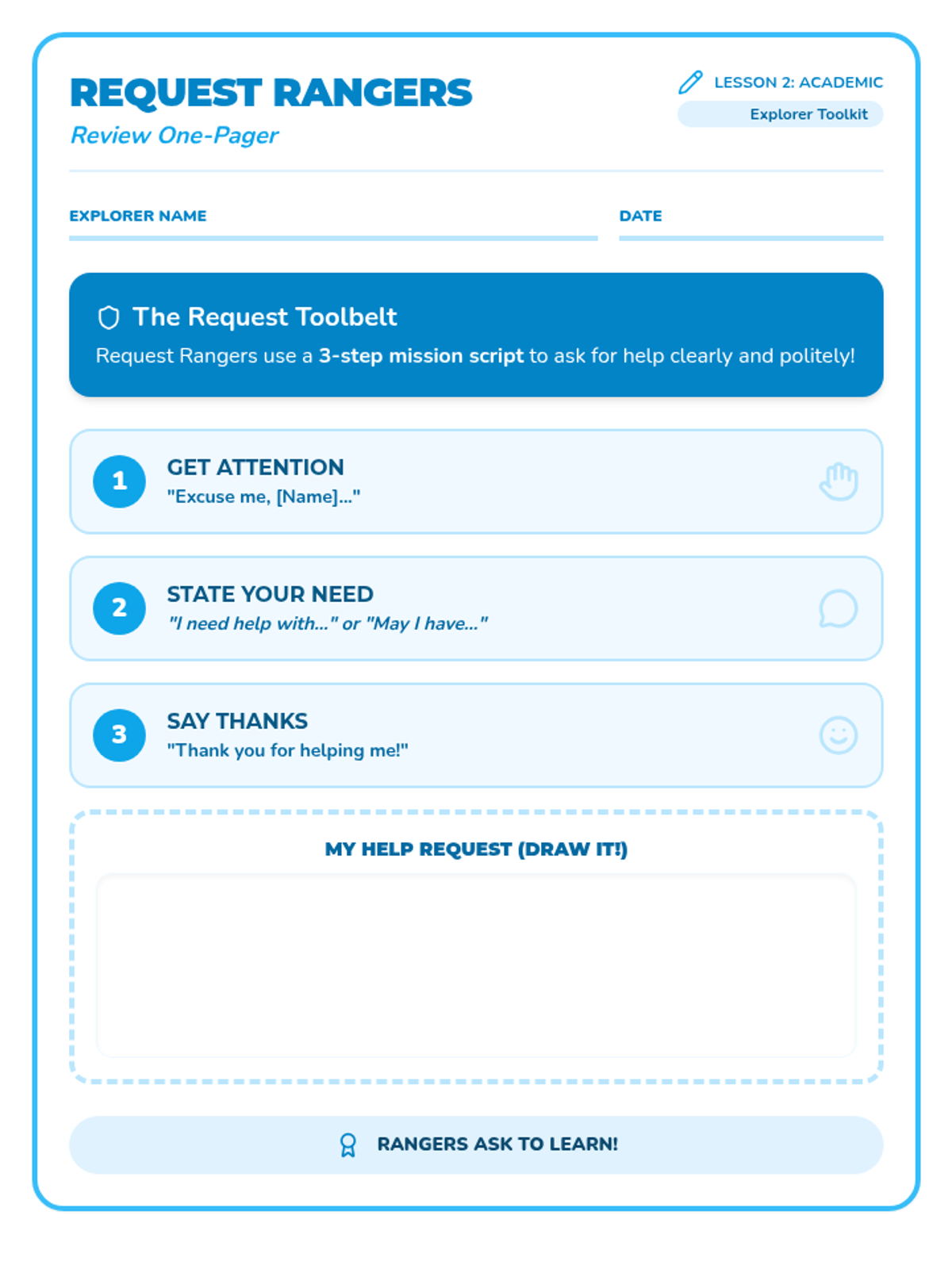 A single-page student review sheet for the 'Request Rangers' lesson, detailing the 3-step mission script for academic help with visual reminders and a practice area.