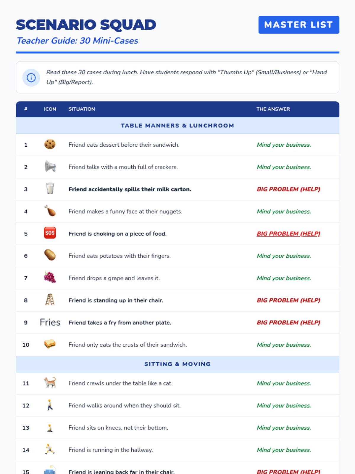 A comprehensive guide for teachers containing 30 varied scenarios to help kindergarteners distinguish between minding their own business and reporting big problems.