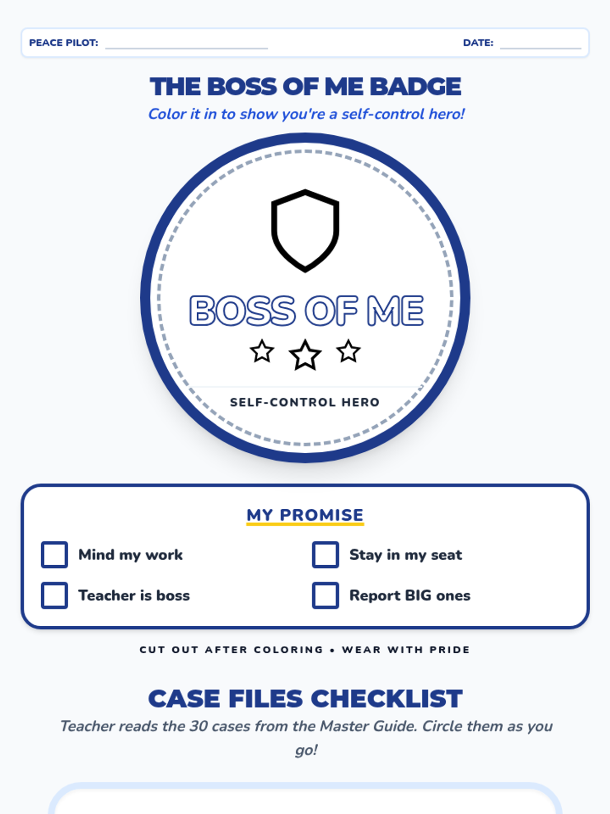 A multi-page reflection handout for kindergarteners including a coloring badge and a 'Case Files' icon grid to follow along with 30 scenarios.