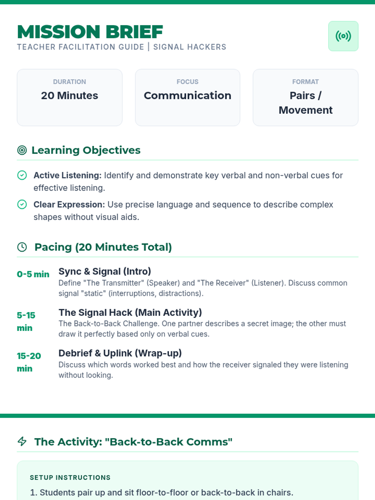 A comprehensive facilitator guide for the Signal Hackers lesson, including a 20-minute pacing plan, activity instructions, discussion prompts, and a set of "Secret Signal" geometric shapes for the activity.