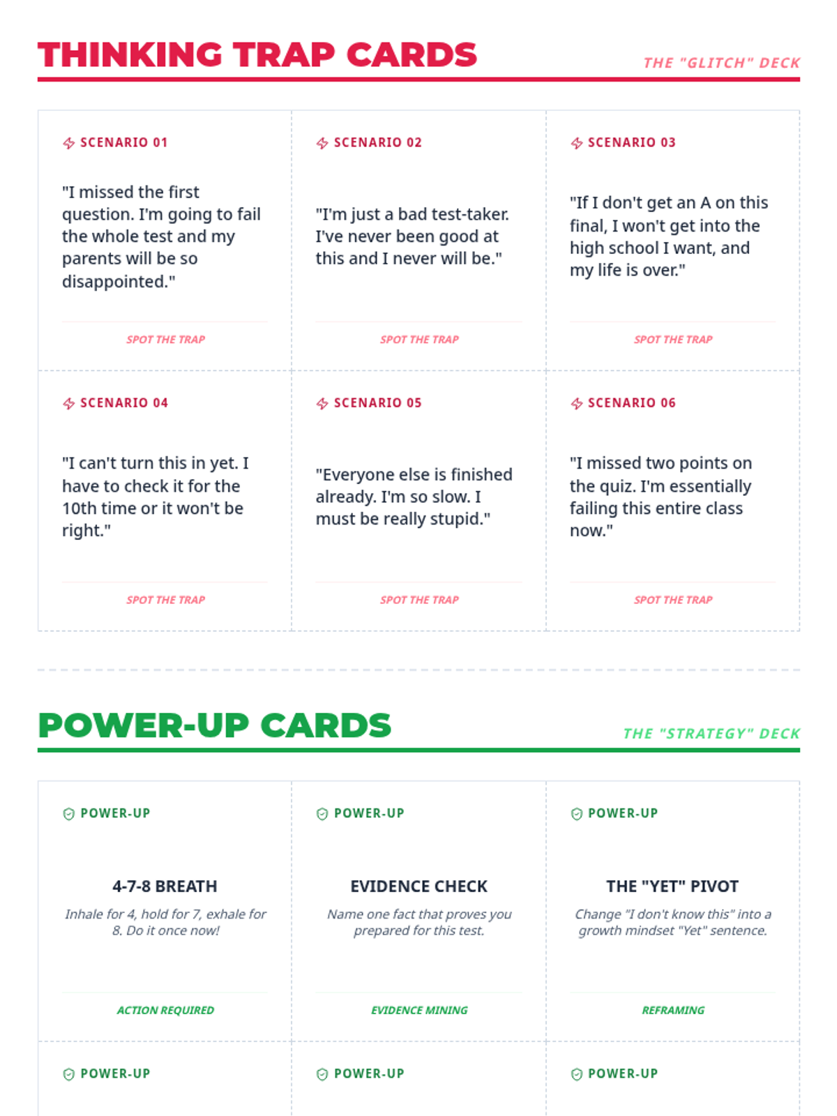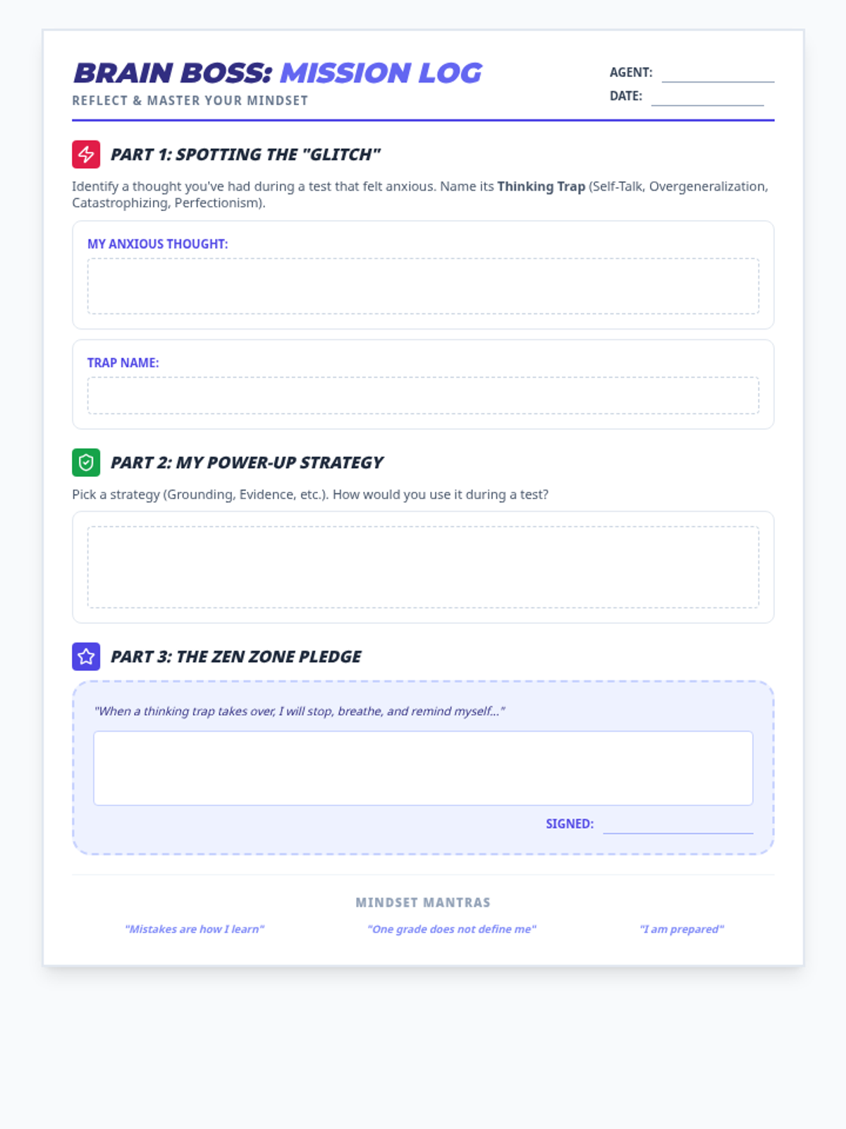 A post-game reflection sheet for students to document their own thinking traps and commit to a strategy for future tests.