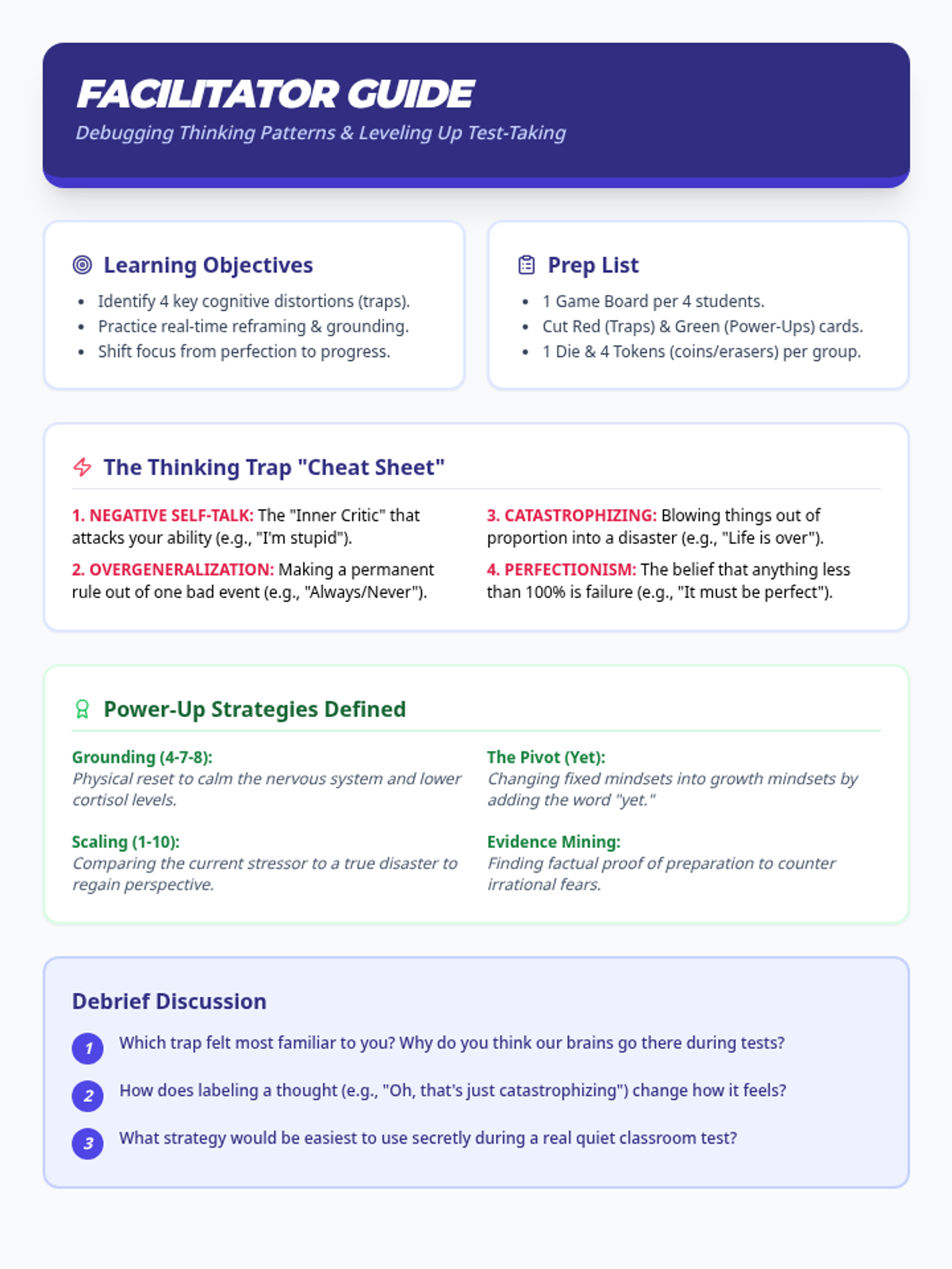 A comprehensive guide for teachers to facilitate the Brain Boss game, including definitions of cognitive distortions and debriefing questions for middle schoolers.