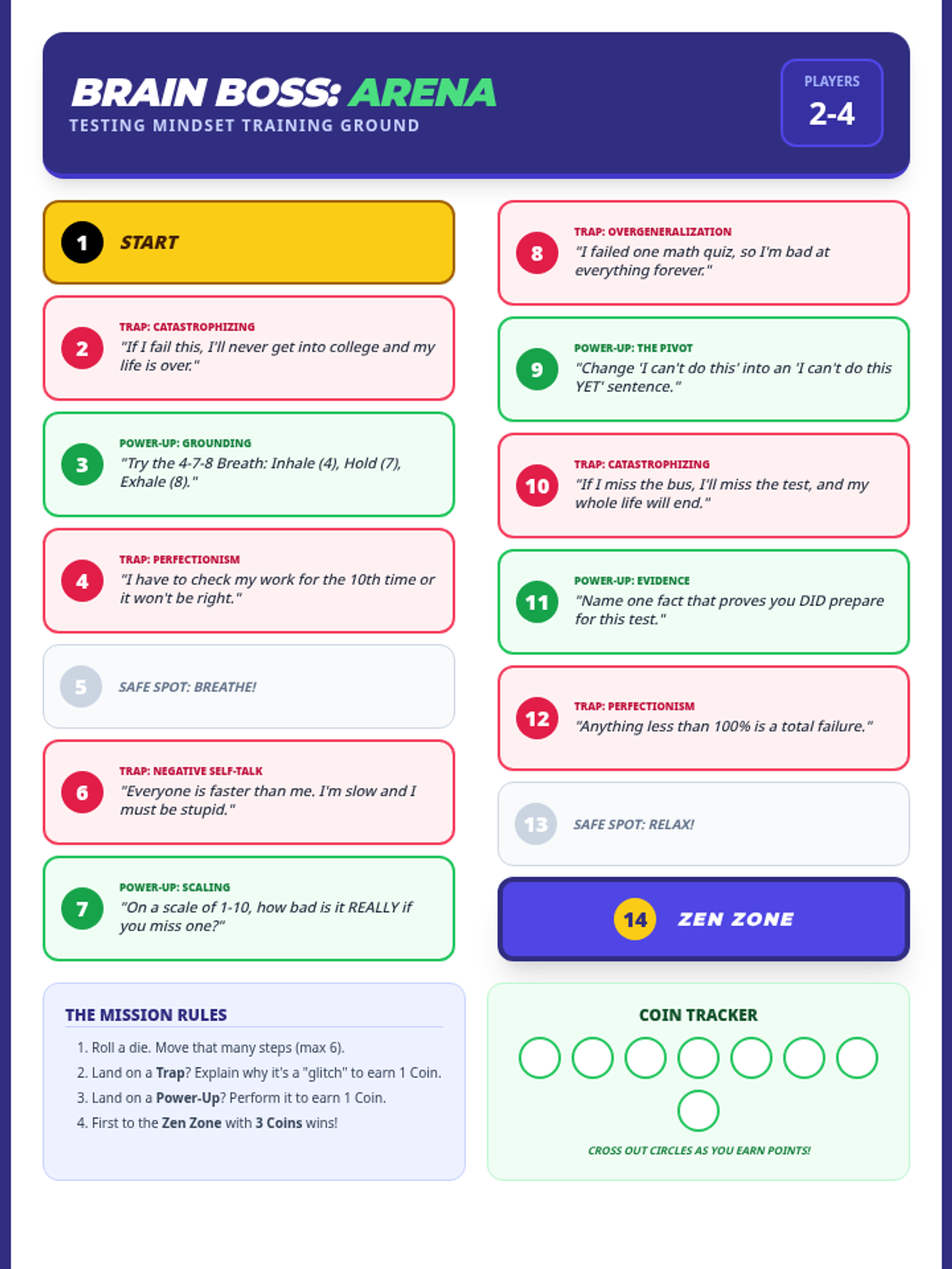 A vibrant, arcade-themed board game for middle school students to practice identifying and overcoming test-related thinking patterns like perfectionism and catastrophizing.