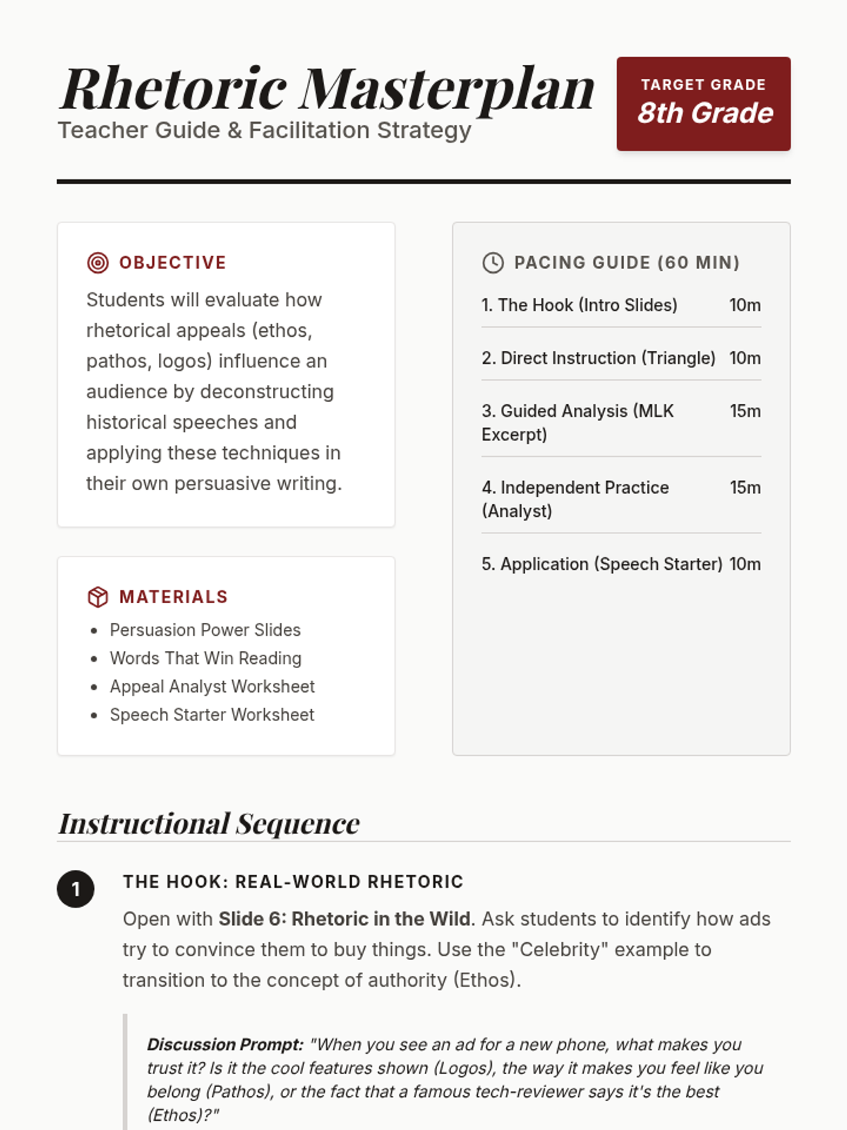 A teacher-facing guide for facilitating the 'Rhetoric in Action' lesson. Includes pacing recommendations, discussion prompts, differentiation strategies, and a complete answer key for the student worksheets.