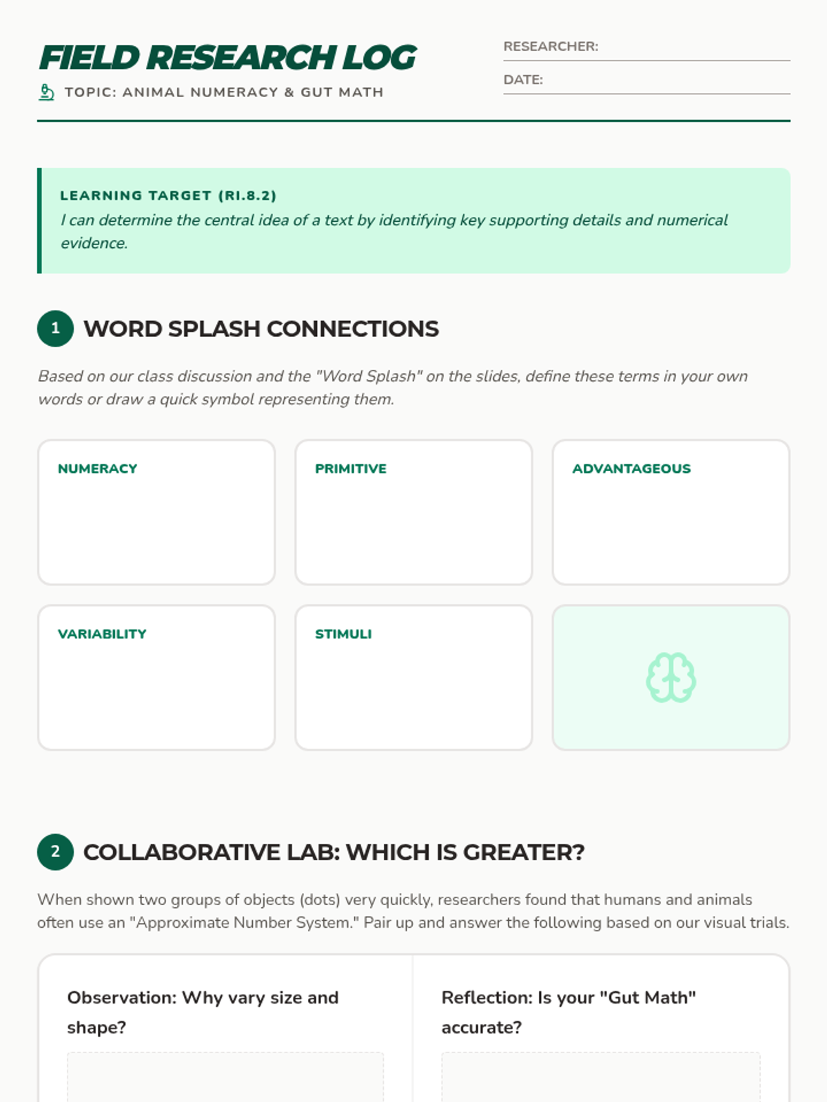 A student-facing field research log for the 'Wild Math Intro' lesson, containing sections for vocabulary (Word Splash), the 'Which is Greater?' activity, discussion responses, and a final summary.