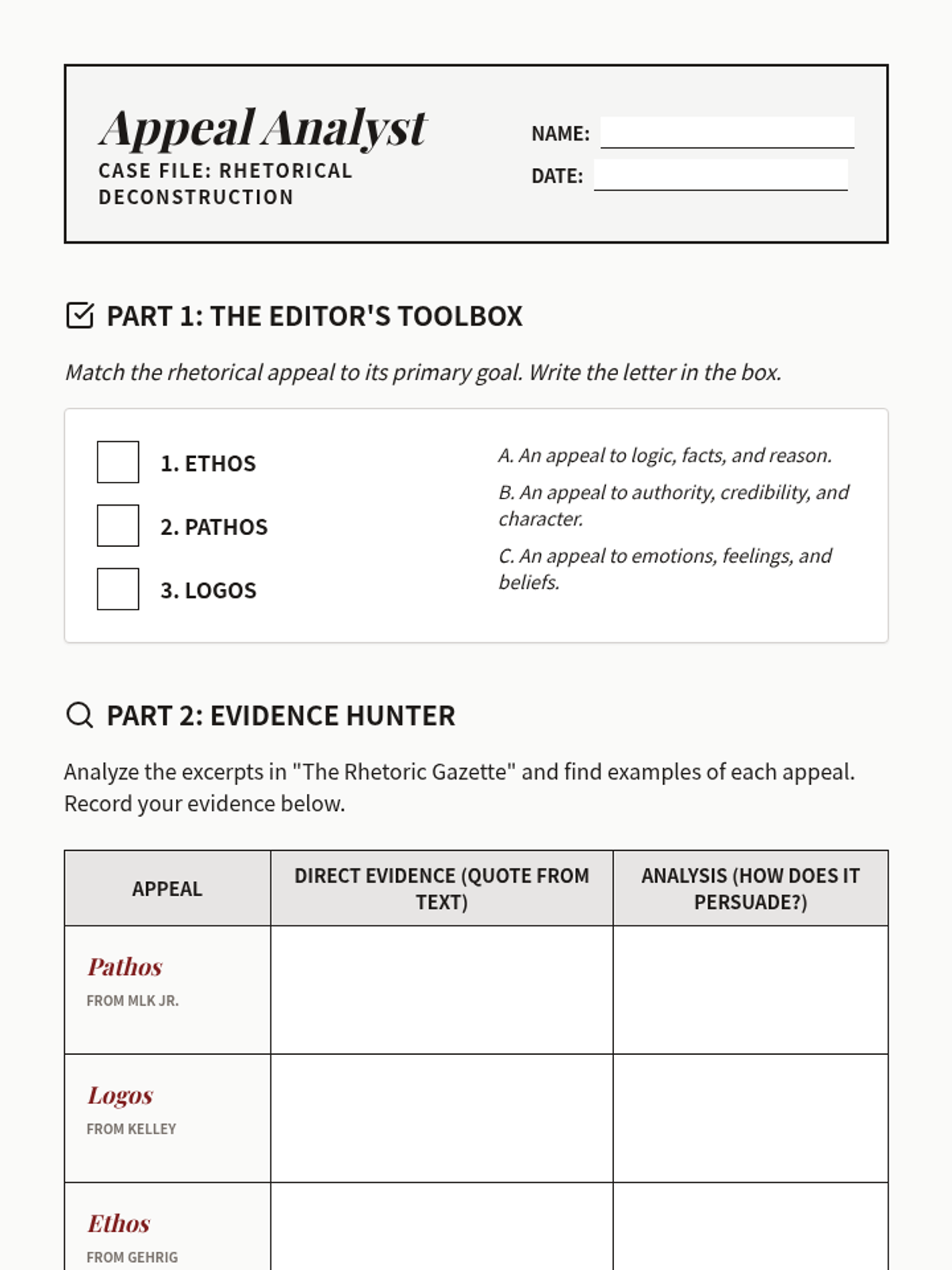 A comprehensive worksheet for deconstructing rhetorical appeals in historical speeches. Includes a definition match, an evidence collection table, and deep-dive analysis questions.